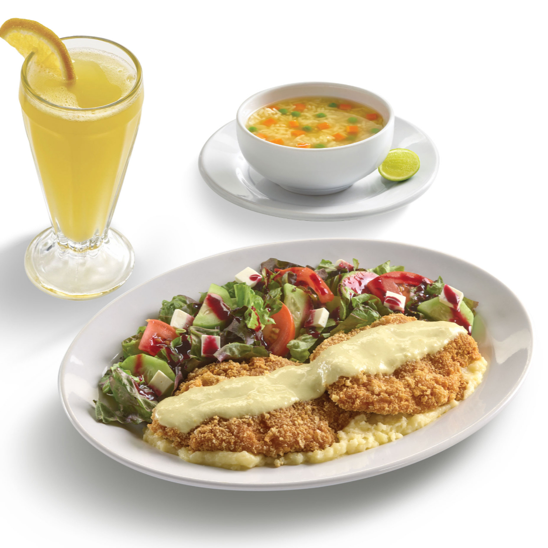 Sábana de pollo empanizada, acompañada de papas saratoga. Incluye consomé de pollo infantil 300 ml. Incluye 1 bolillo por platillo
