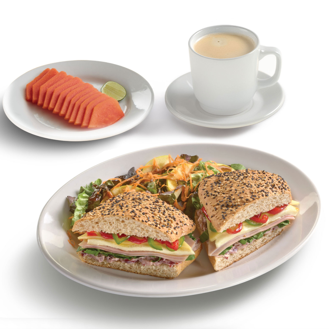 Sándwich de pan integral con queso amarillo, jamón, lechuga y jitomate, decorado con papas a la francesa. (Incluye consomé de pollo infantil 300 ml.