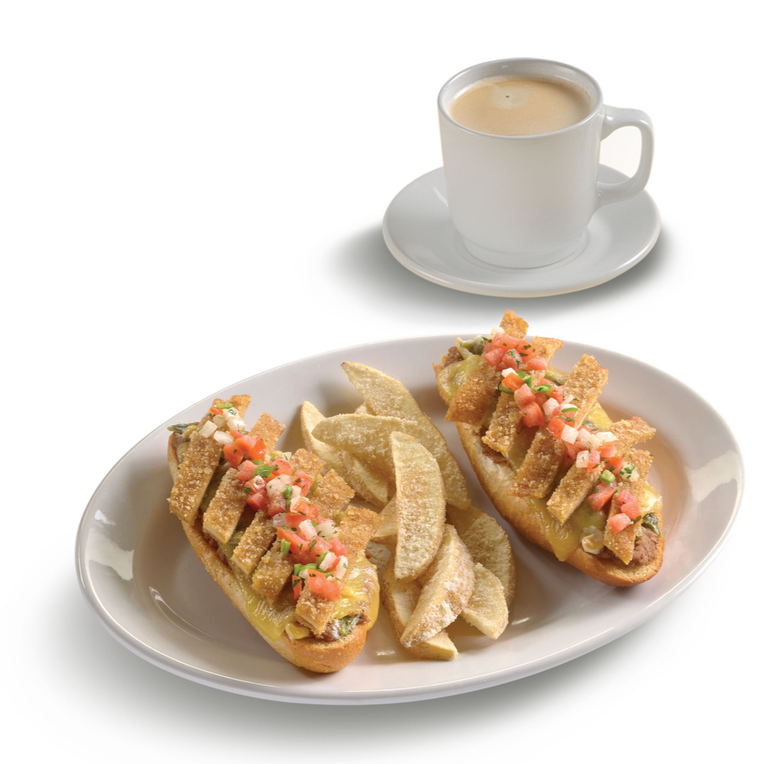 Dos piezas con frijoles refritos, queso gouda, tiras de milanesa de pollo y pico de gallo. Acompañados de papas gajo con queso parmesano