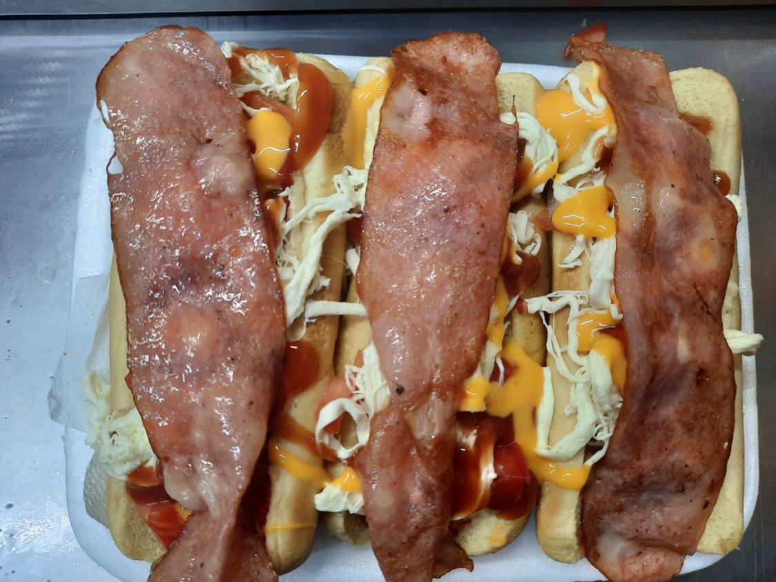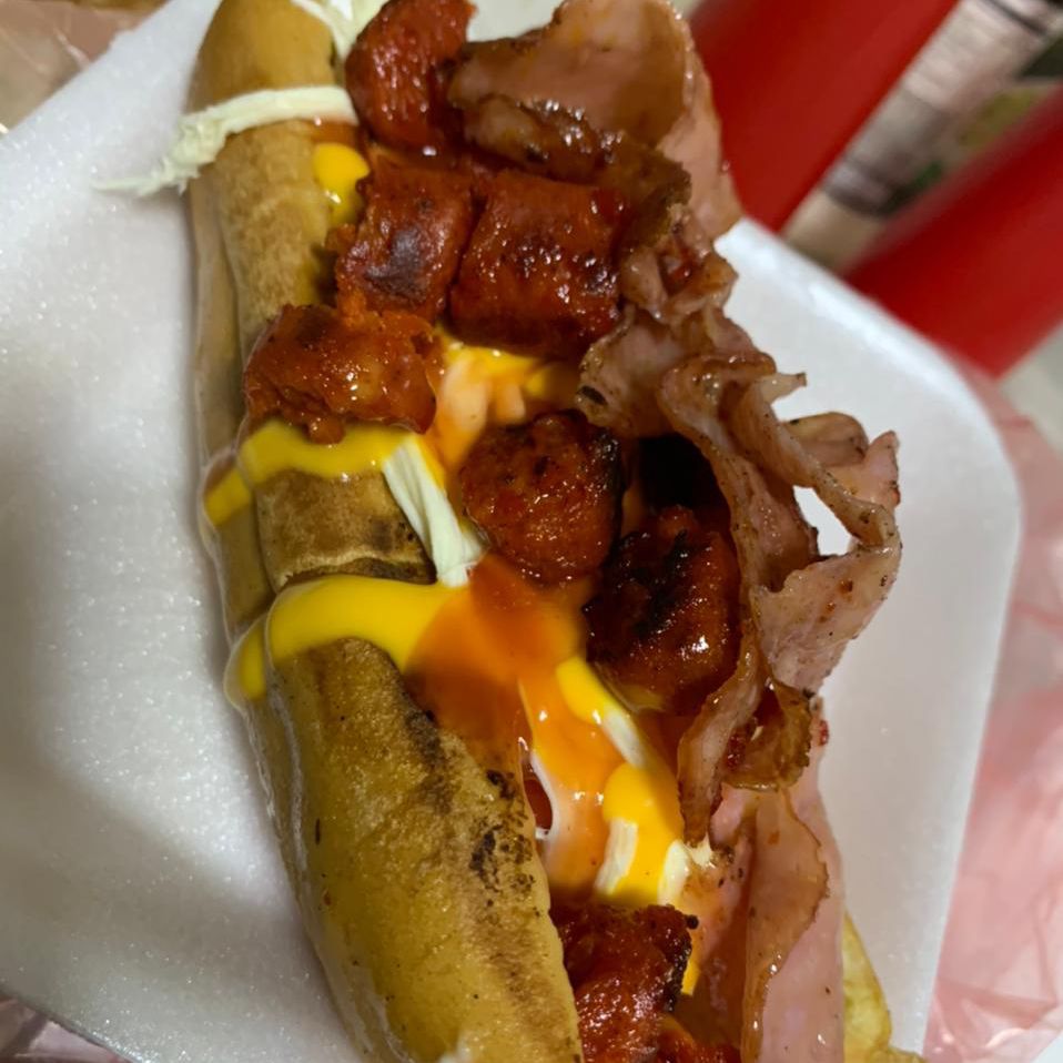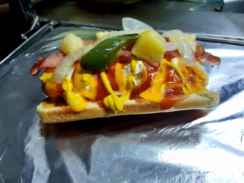 Salchicha envuelta con tocino ,jitomate ,catsup,queso amarillo,queso de hebra,mayonesa ,chorizo,peperoni,chicharron,salami,tocino