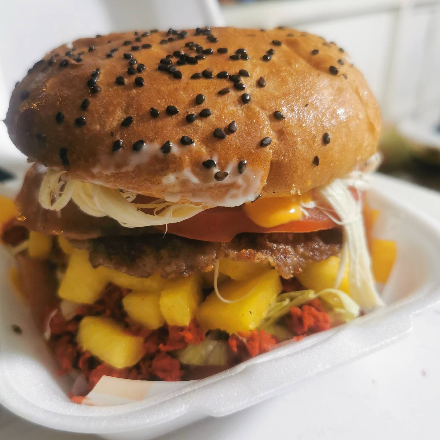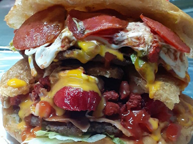 incluye dos ruedas de carne lechuga jitomate y catsup queso amarillo queso de hebra a la plancha aguacate jamón tocino y 5 ingredientes