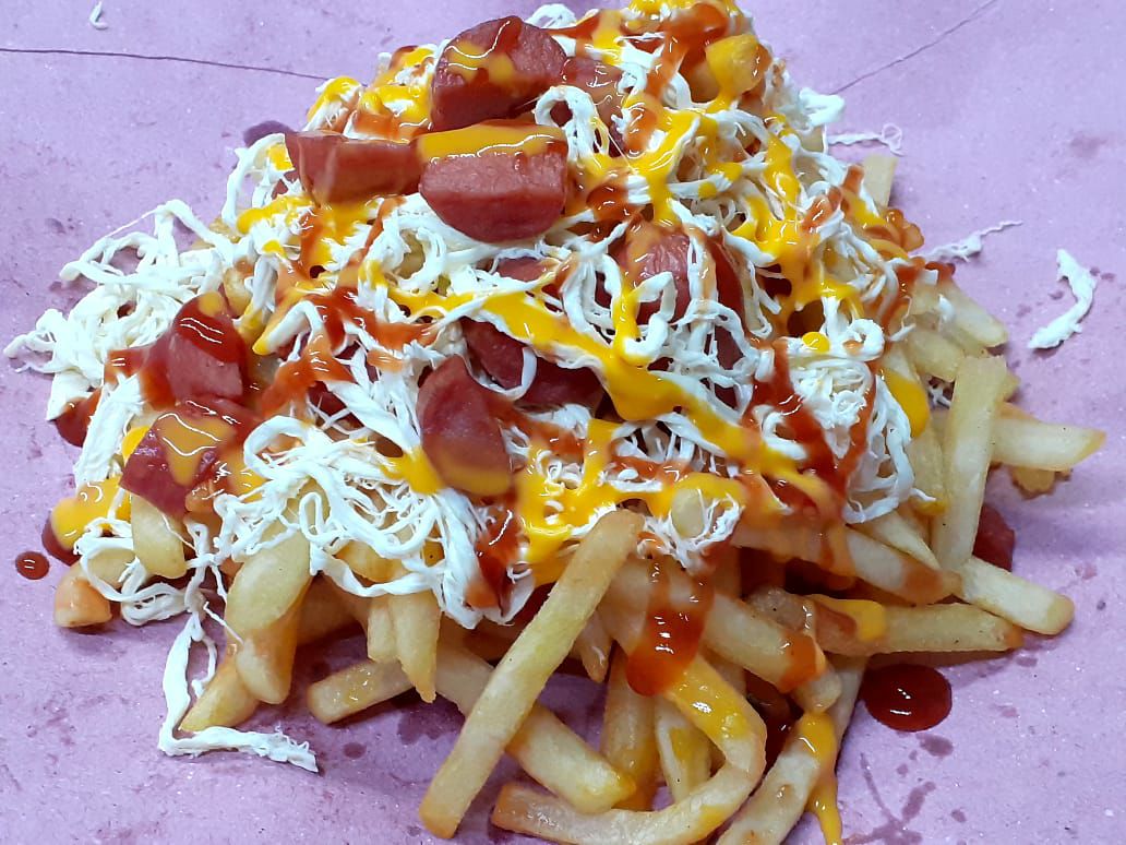 Papas ala francesa, queso amarillo, cátsup y queso de hebra.