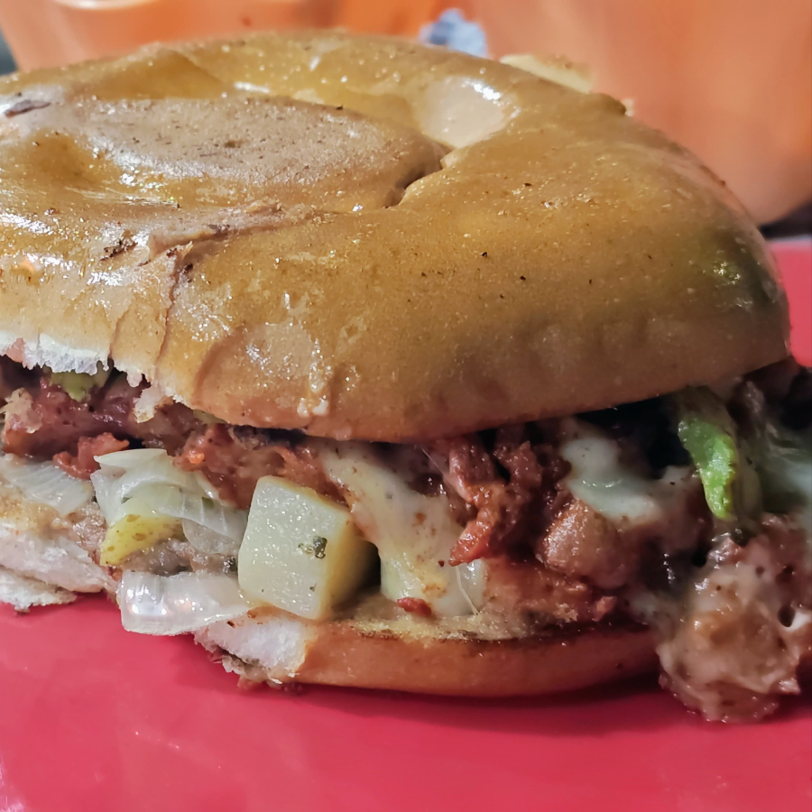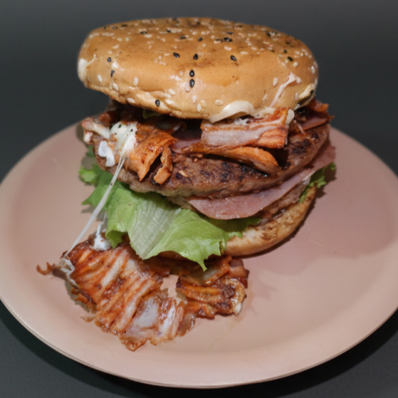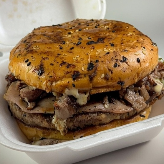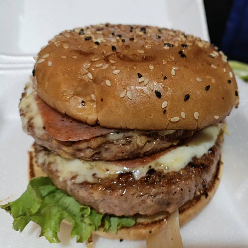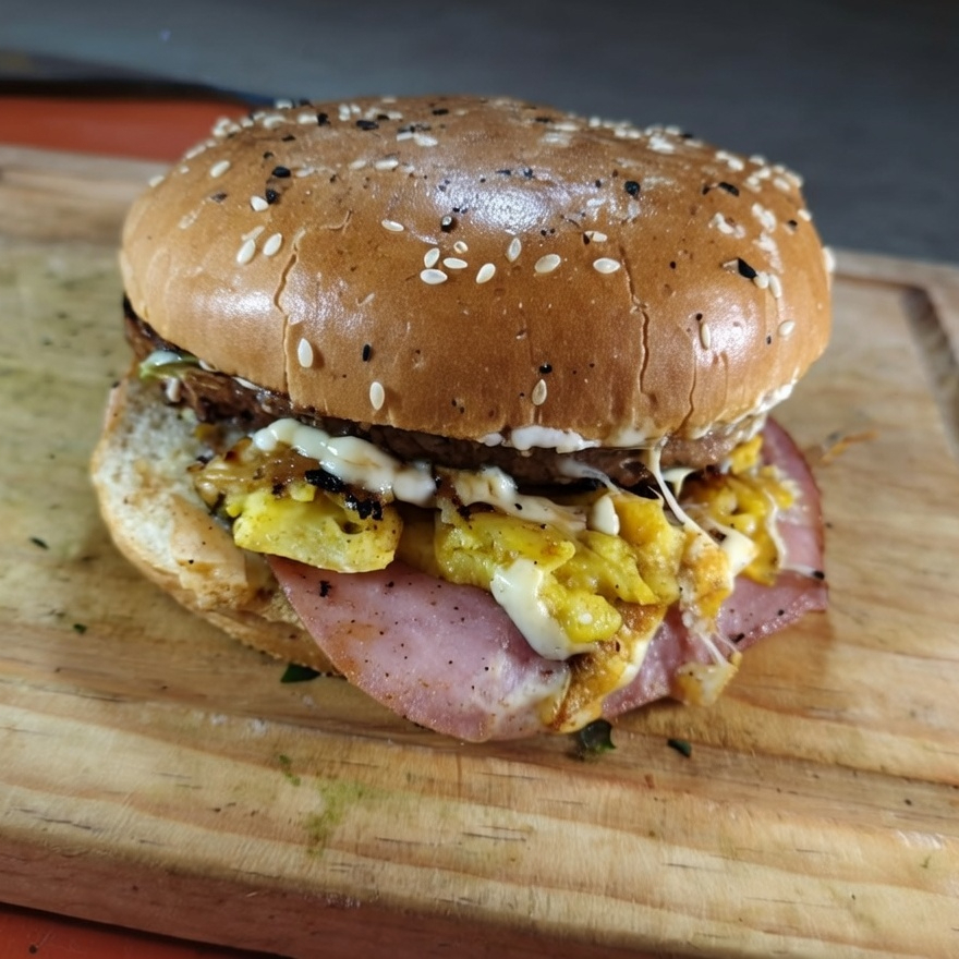 Hamburguesa con mayonesa, cebolla asada, lechuga, carne de sirloin, jamón, pastor con queso y aguacate, en pan parrillero