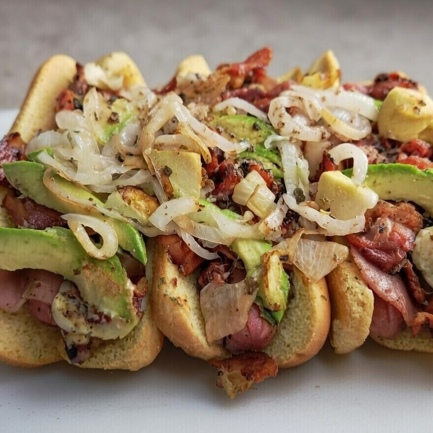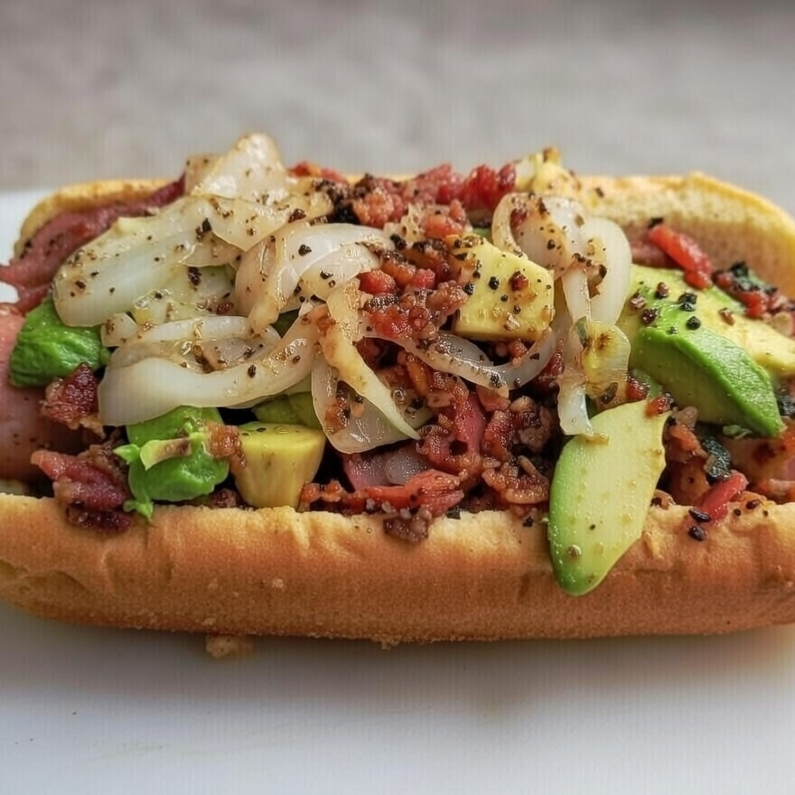Hot dog con salchicha de pavo, mayonesa, crema, jamón, pastor con queso, aguacate y cebolla asada