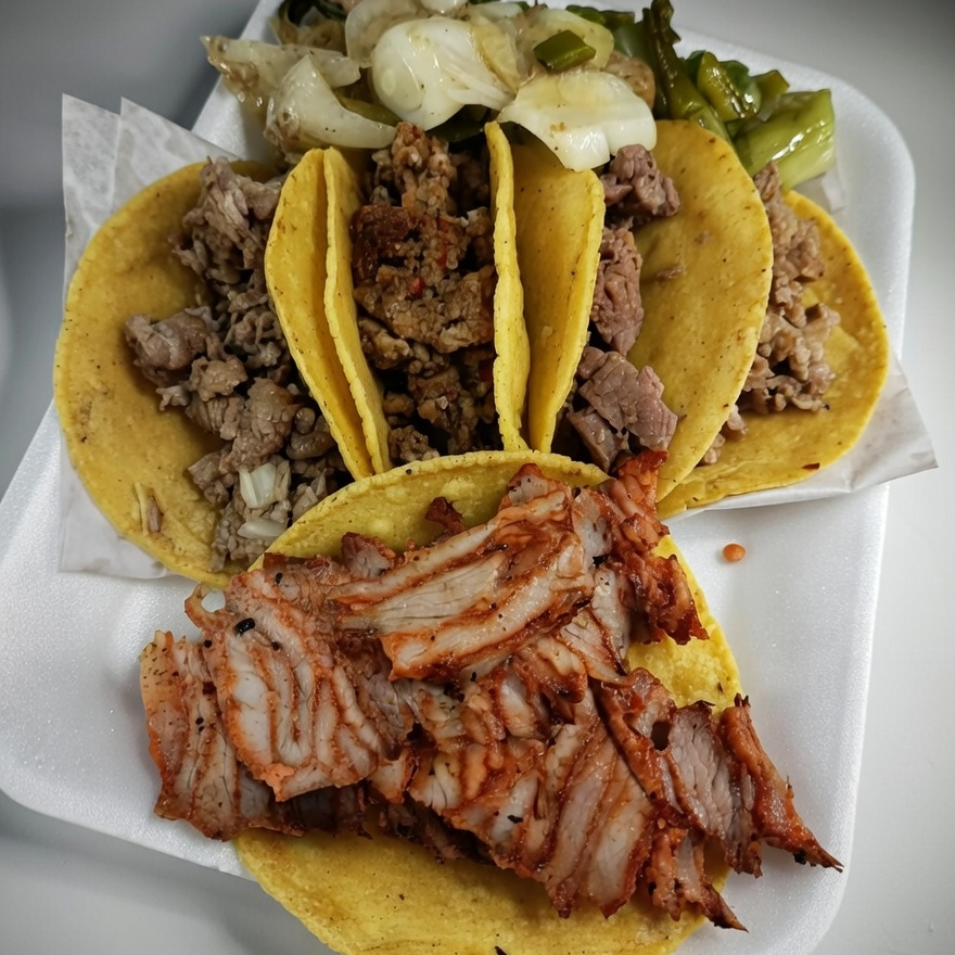 5 tacos de doble tortilla de maíz (Suadero, Bistec, Longaniza, Arrachera) Cebolla con cilantro, limones y salsa