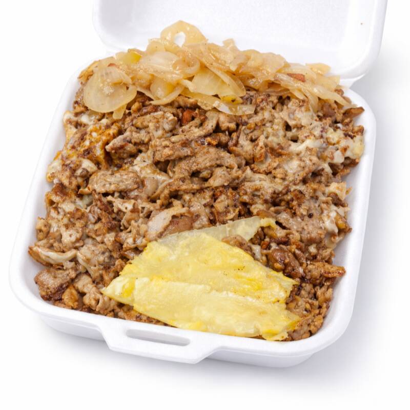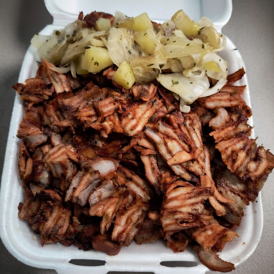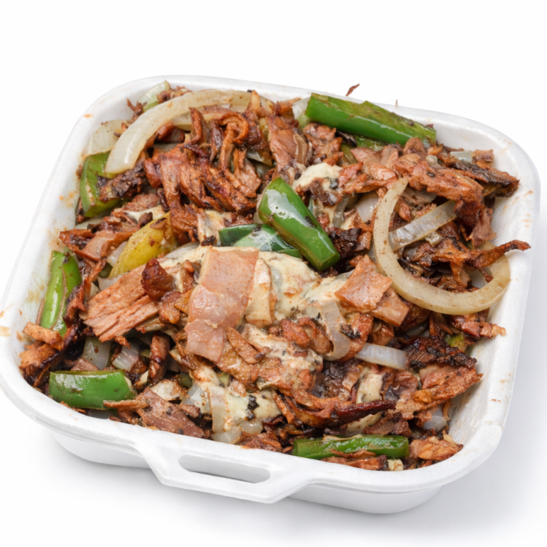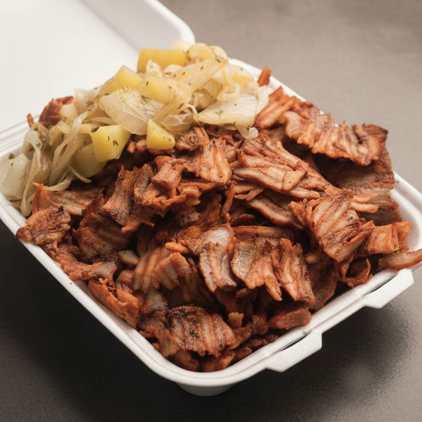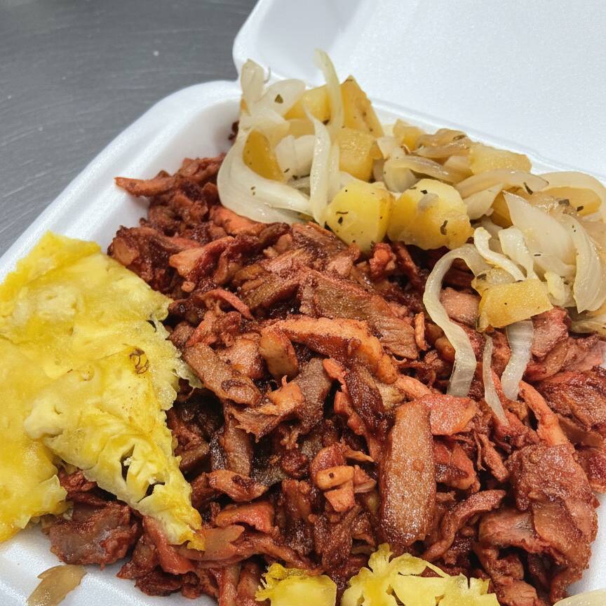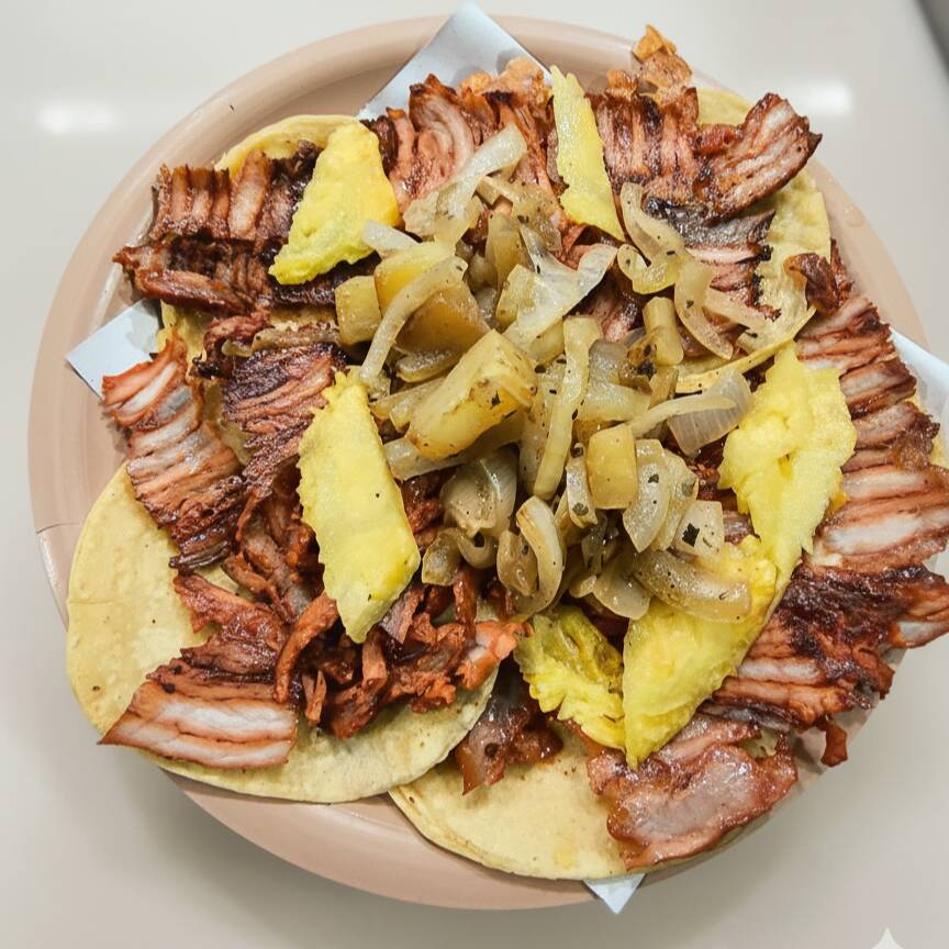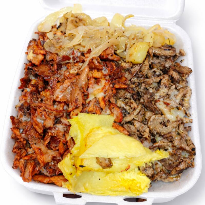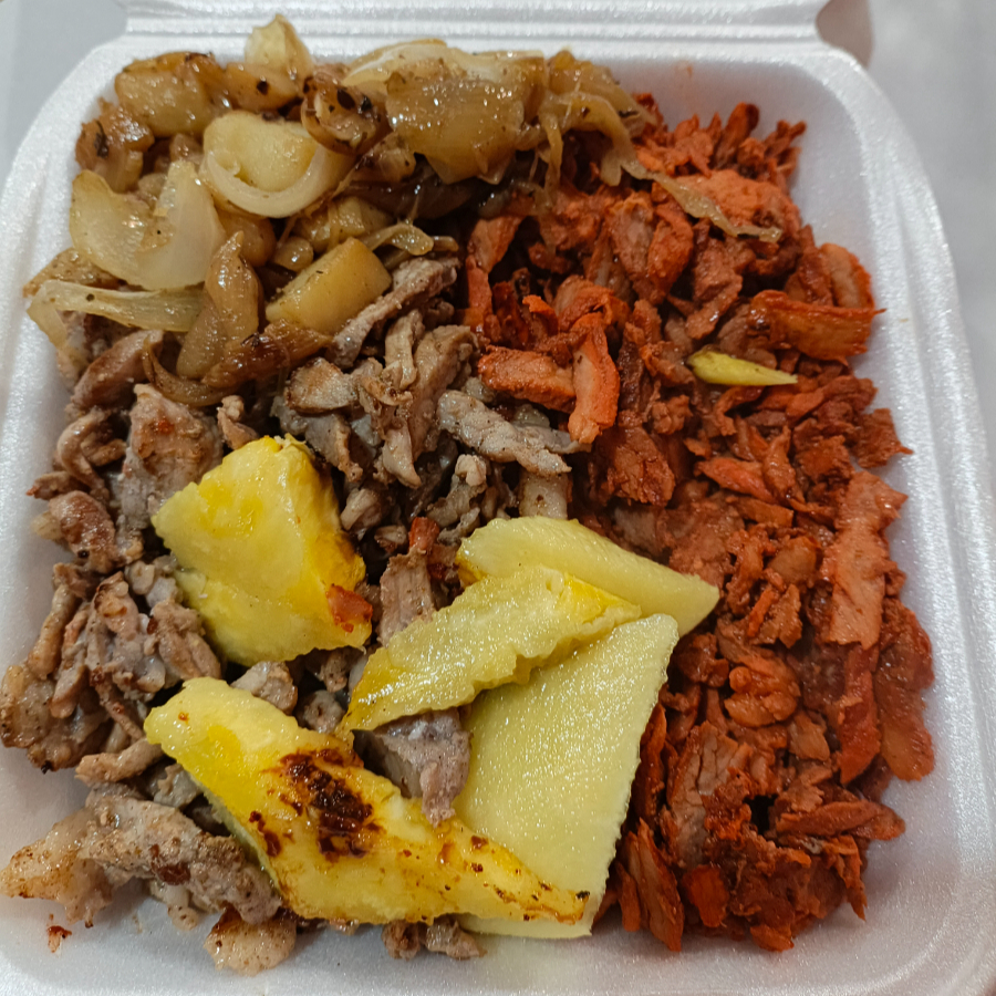 Carne de pastor y carne de chuleta combinados con un excelente mix de queso, acompañado de cebolla con papa, piña, cebolla con cilantro, salsas, limones y tortillas