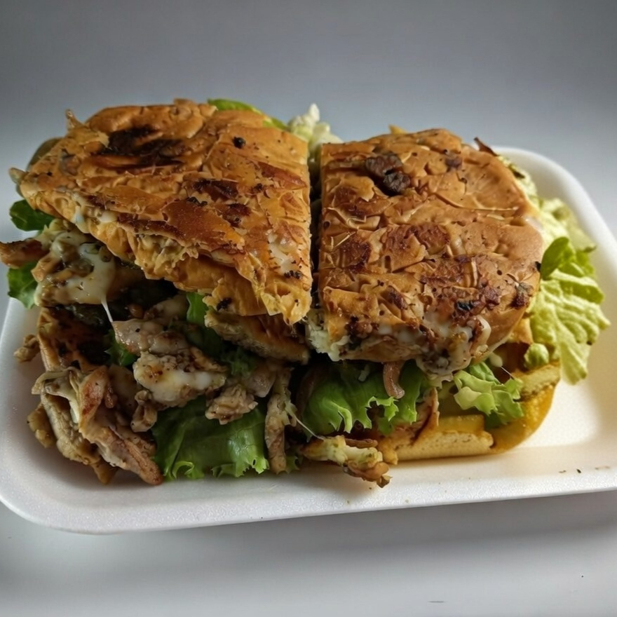 Pan parrillero, dos carnes de sirloin, 2 piezas de jamón, 2 quesos, cebolla asada, lechuga, mayonesa y aguacate
