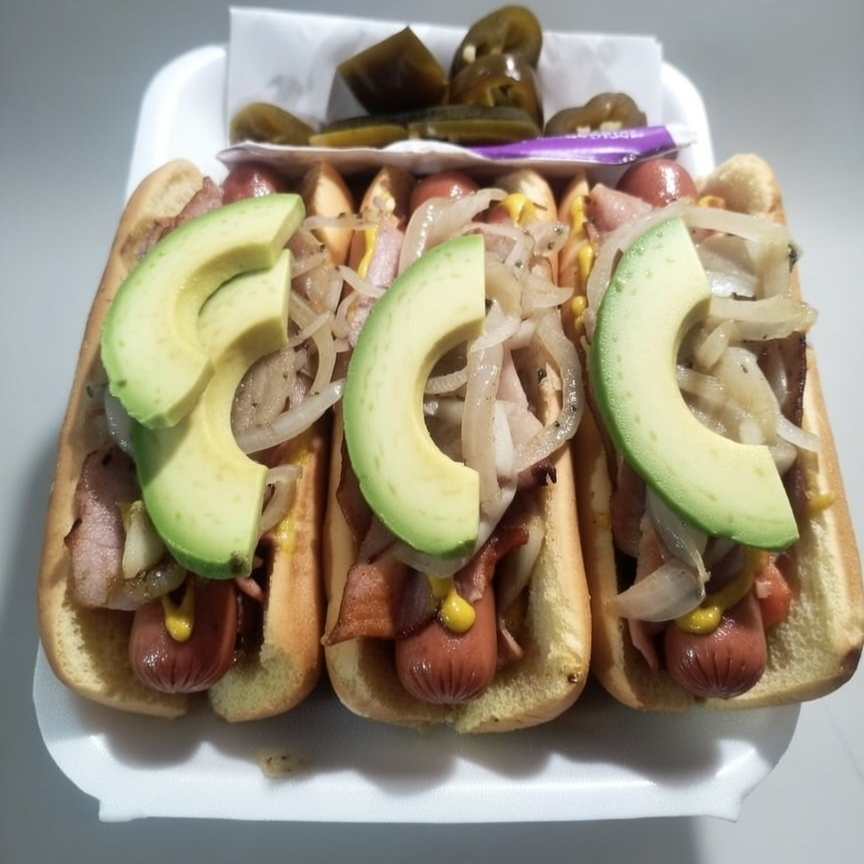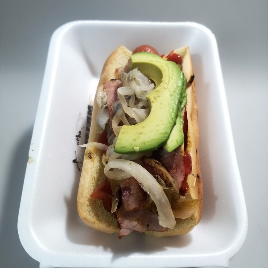 Pan de Hot dog con mayonesa, crema, salchicha de pavo, jamón, aguacate, tocino, cebolla asada con papa, aguacate acompañado de chiles en vinagre y catsup