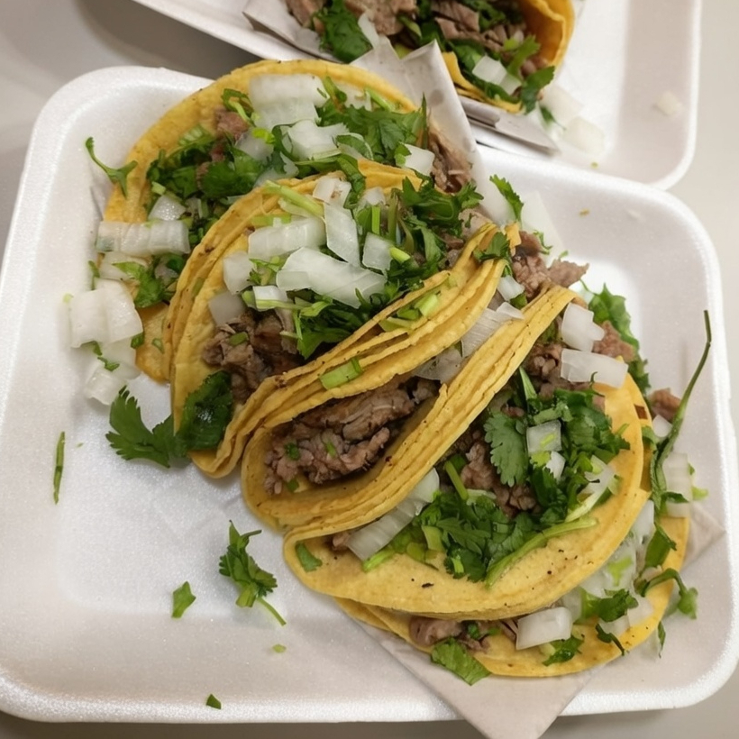 5 tacos doble tortilla de maiz, bistec de res, acompañado de cebolla con cilantro, limones salsa y cebollines