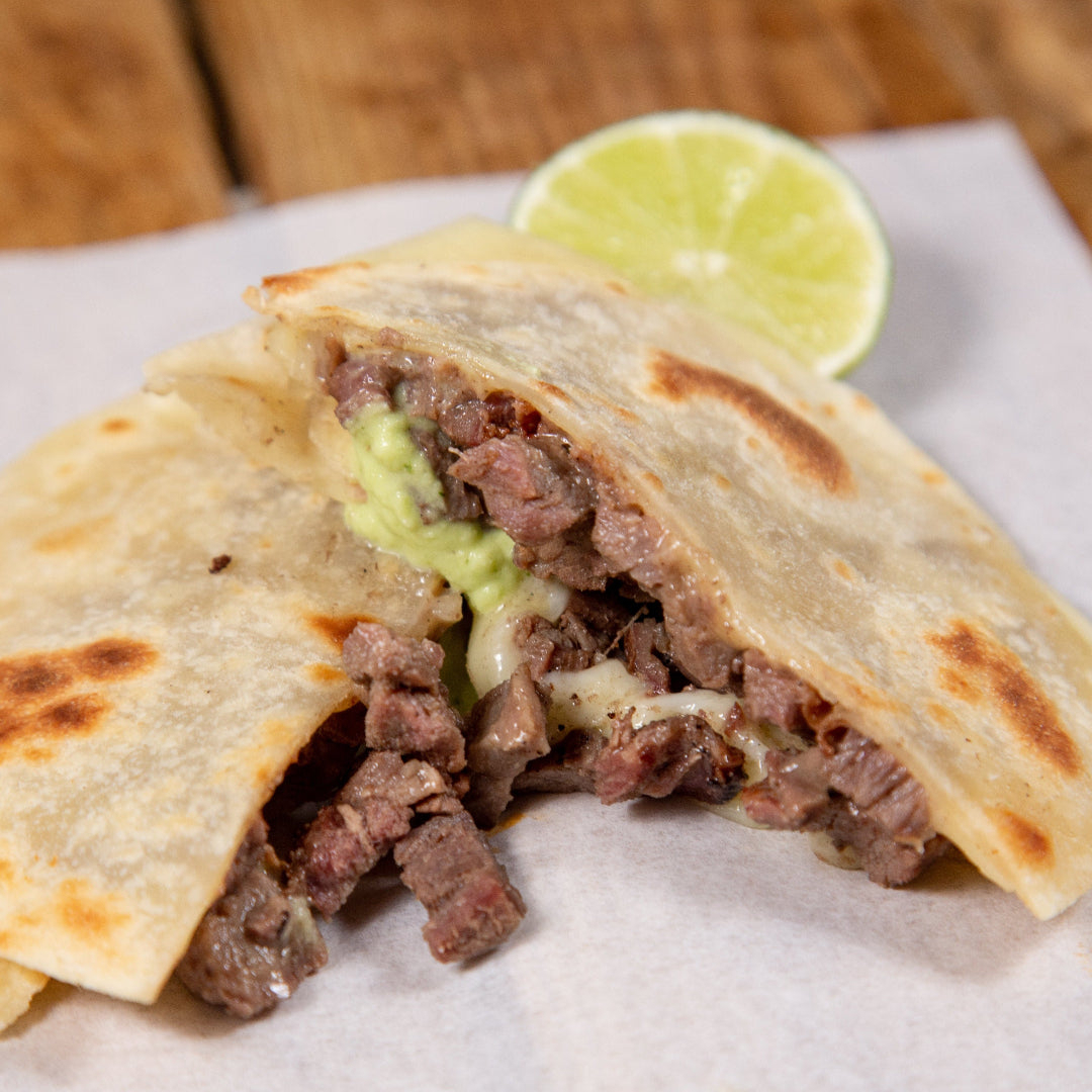 Tortilla de Harina con arrachera con queso, cebolla asada, limones, salsa