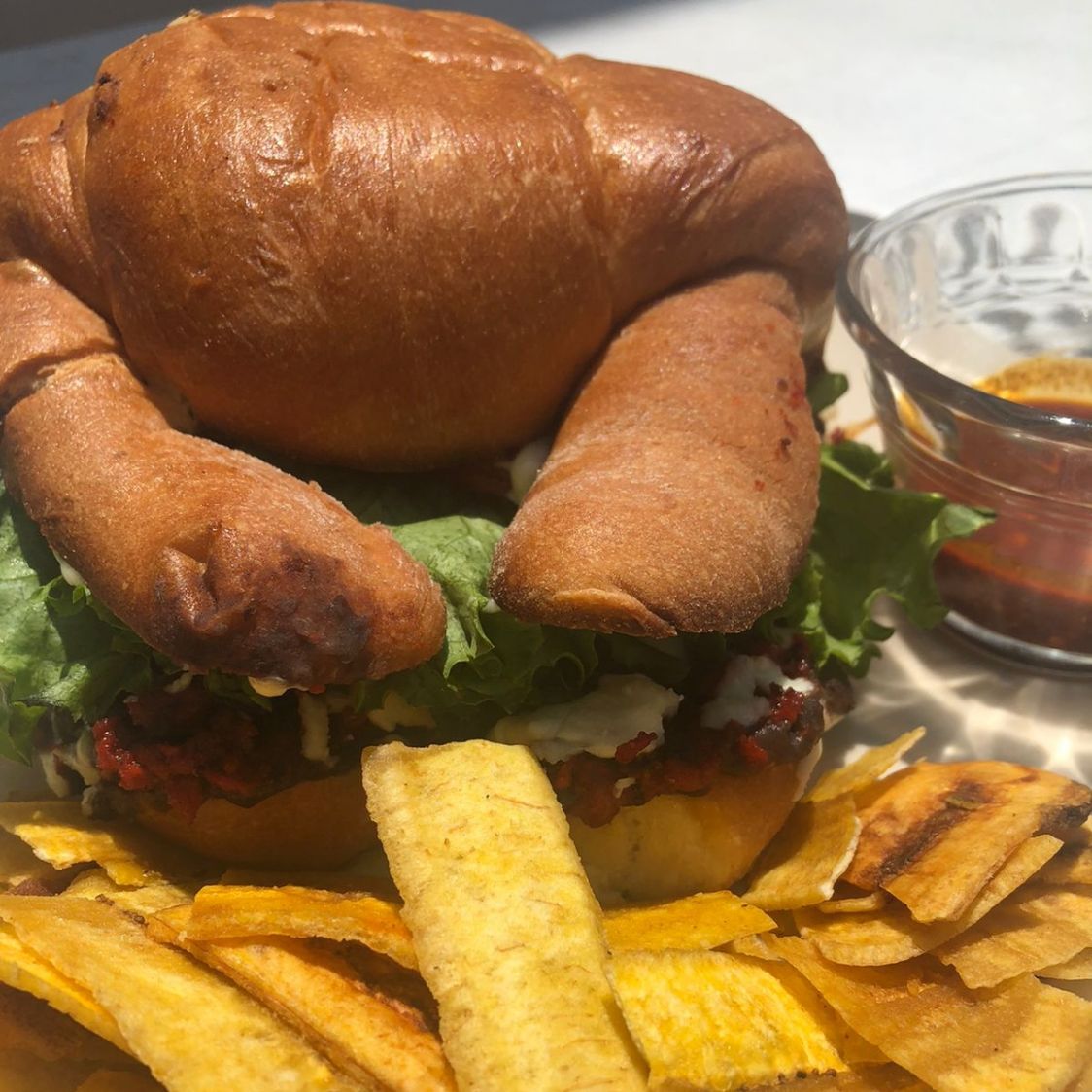 Cuerno grande con mayonesa visado a elegir verdura a elegir y chips de papas o plátanos con rajas aparte