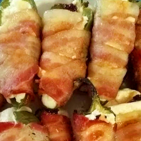 CHILE JALAPEÑO RELLENO DE QUESO Y CAMARON ENVUELTO DE TIRAS DE TOCINO, ACOMPAÑADO DE TORTILLAS, ARROZ, COL Y ADEREZOS
