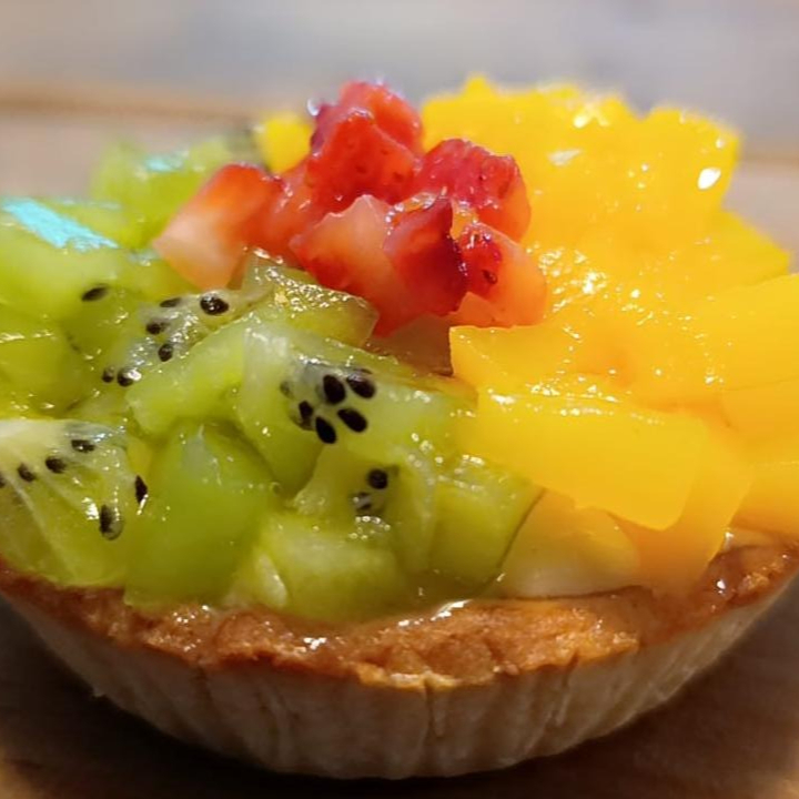 BASE DE MASA QUEBRADA, CON RELLENO DE CREMA PASTELERA ARTESANAL, DECORADA CON FRUTAS DE TEMPORADA