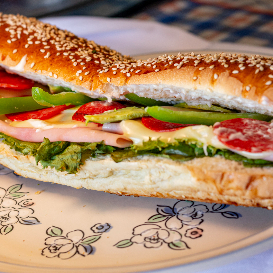 Chile morrón, lechuga, jamón, queso manchego, tomate, catsup, mostaza y pepperoni