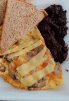 Huevo, champiñones, queso manchego, frijoles y rebanada de pan integral.