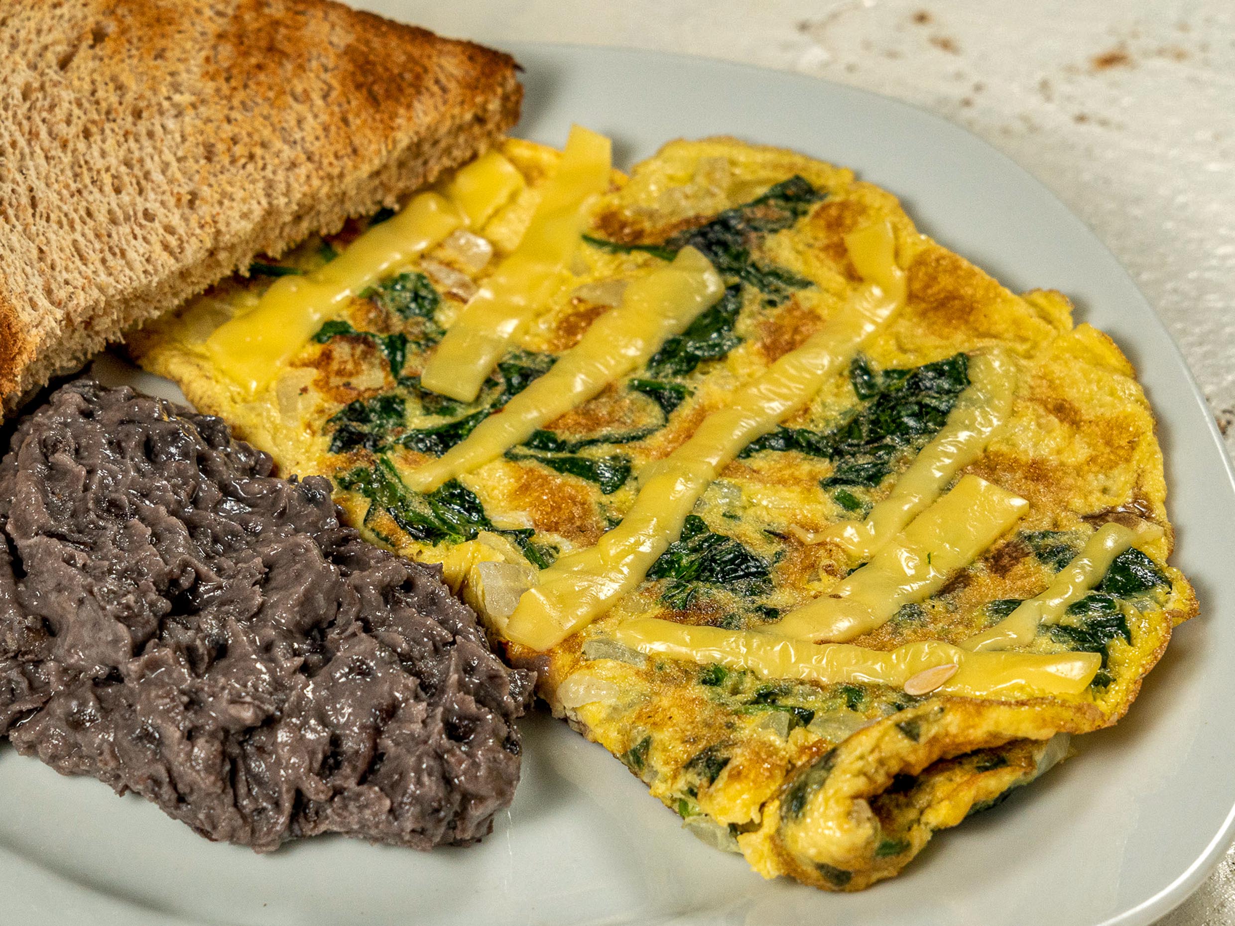 Espinaca, , cebolla y chile, frijoles y queso manchego. Acompañado de pan integral