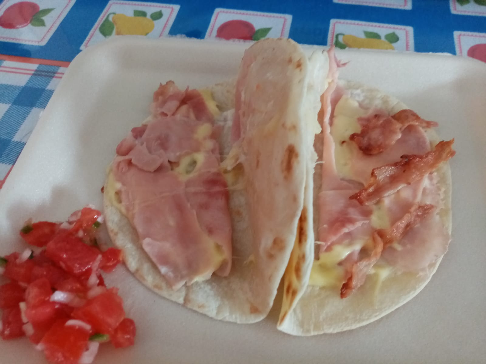 Orden de 2 sincronizadas, queso manchego, jamón, tocino y salsa mexicana.