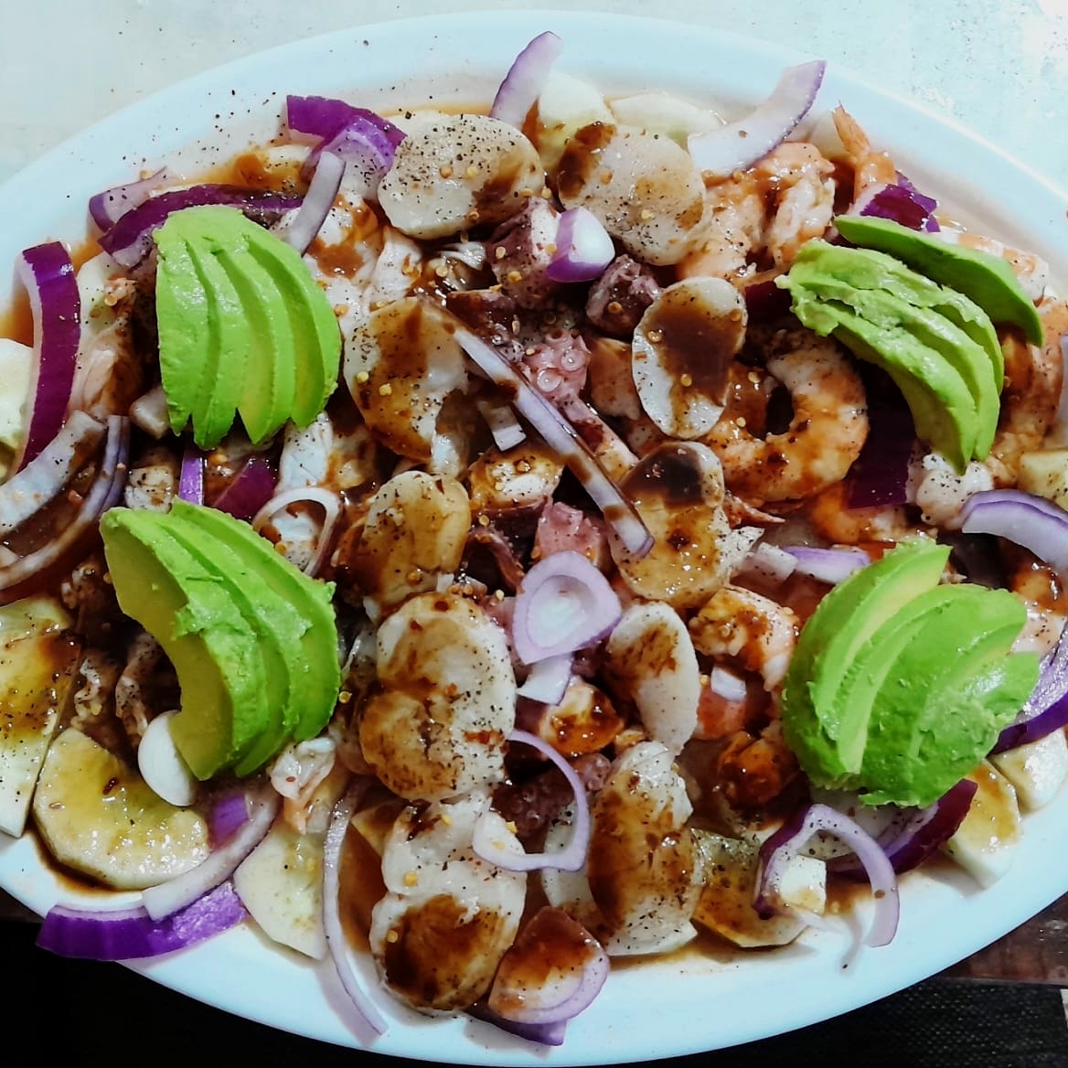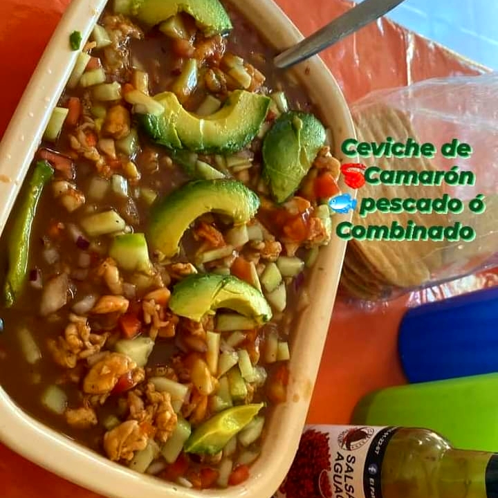 CAMARON Y PESCADO CURTIDO EN LIMON, CON TOMATE, CEBOLLA PEPIDO, aderezo sinaloense.
