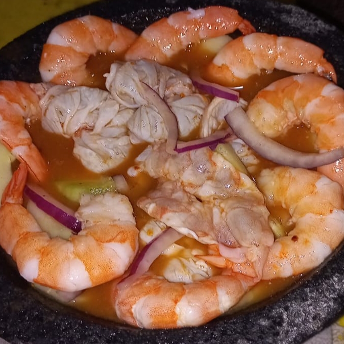 Camarón curtido en limon, camarón cocido, cebolla morada, pepino, picante con sazón sinaloense.