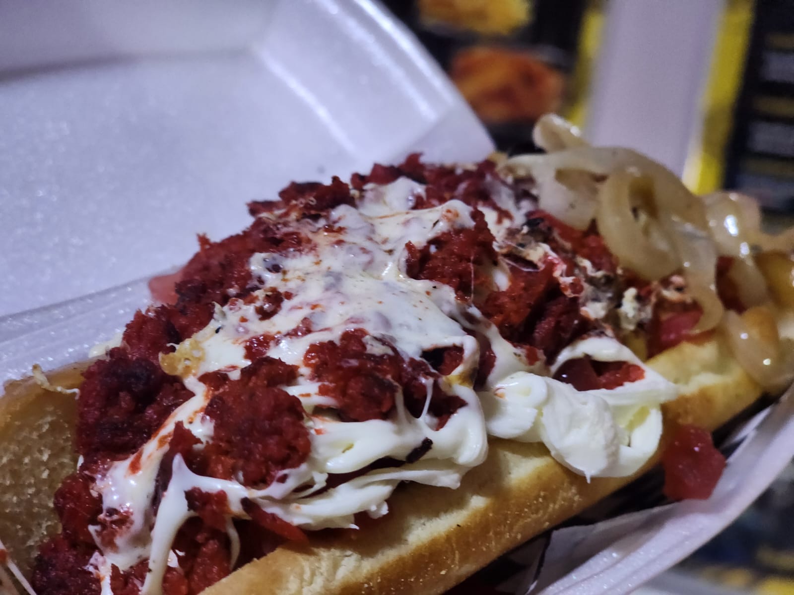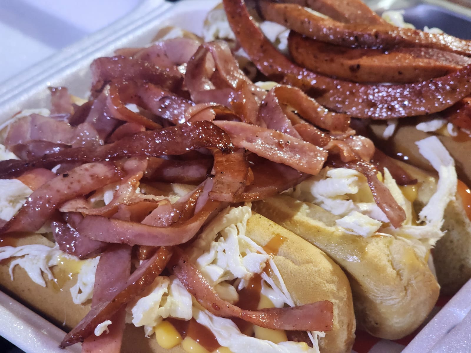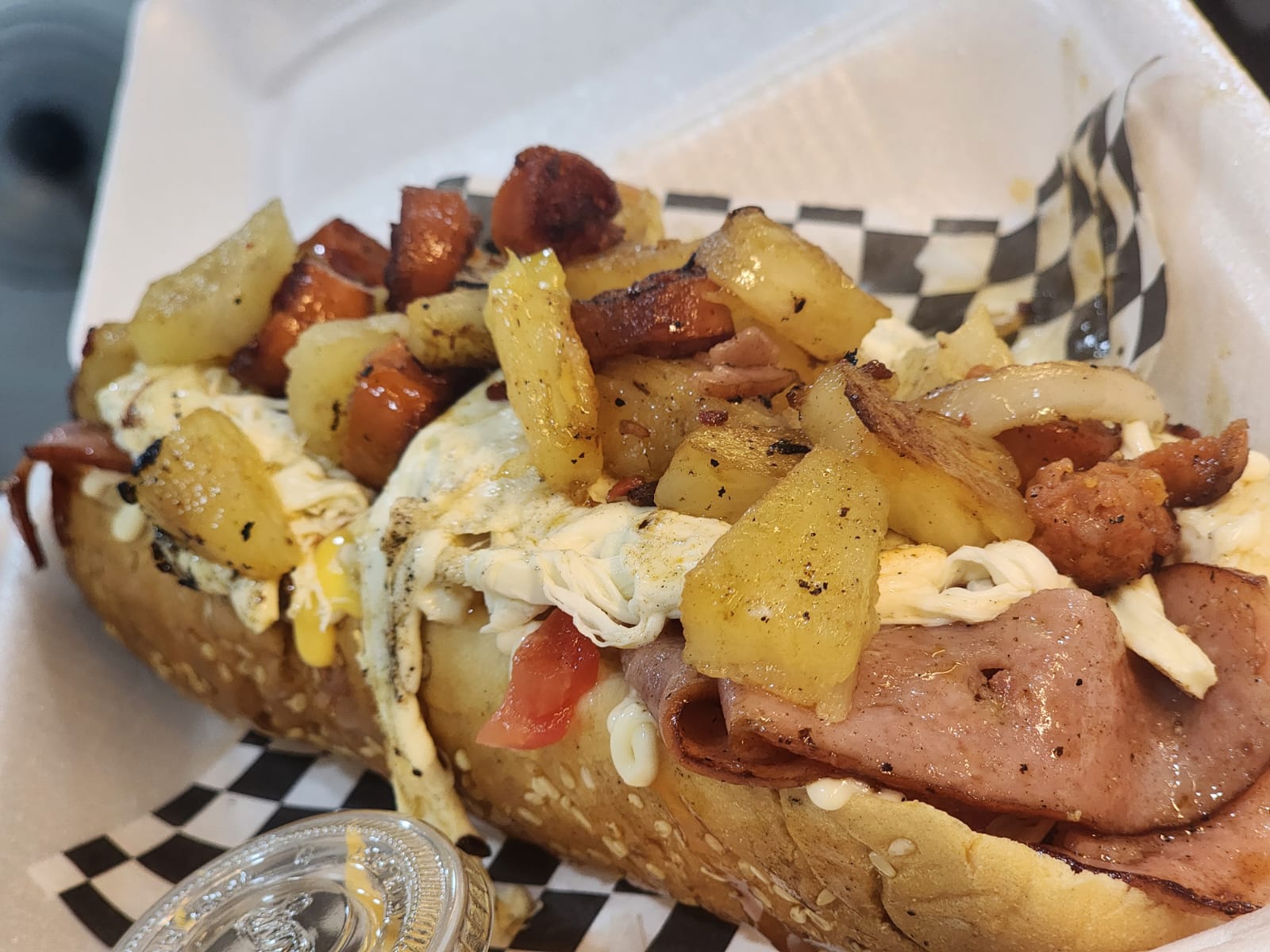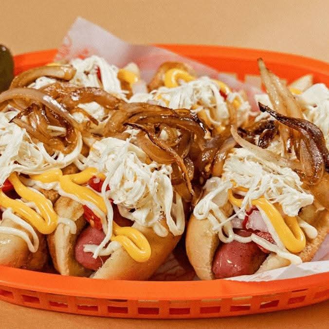 Pan extragrande, salchicha jumbo de res, tocineta, queso amarillo gratinado, piña, cebolla caramelizada, aderezo de la casa.