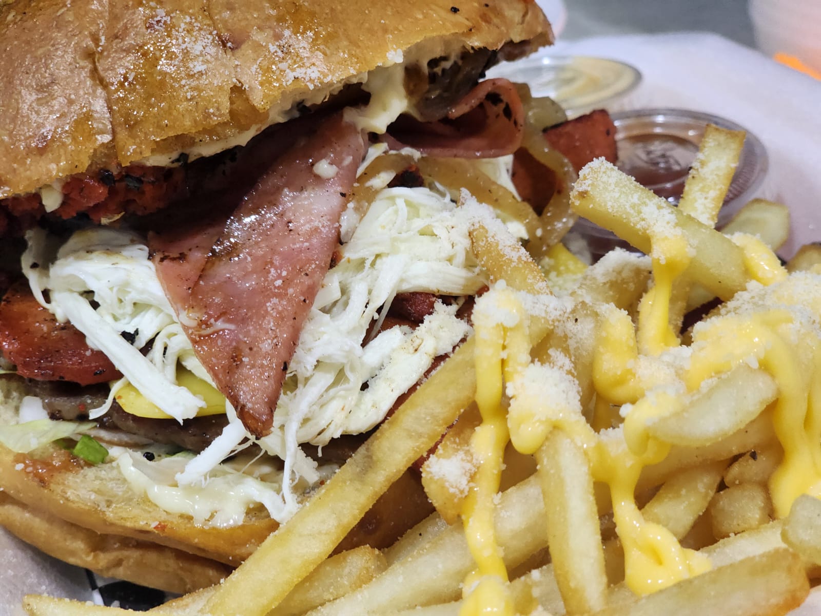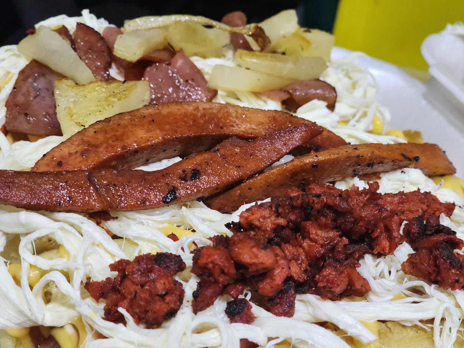 Queso hebra, tocineta, chorizo, piña, salchichón, cebolla asada.