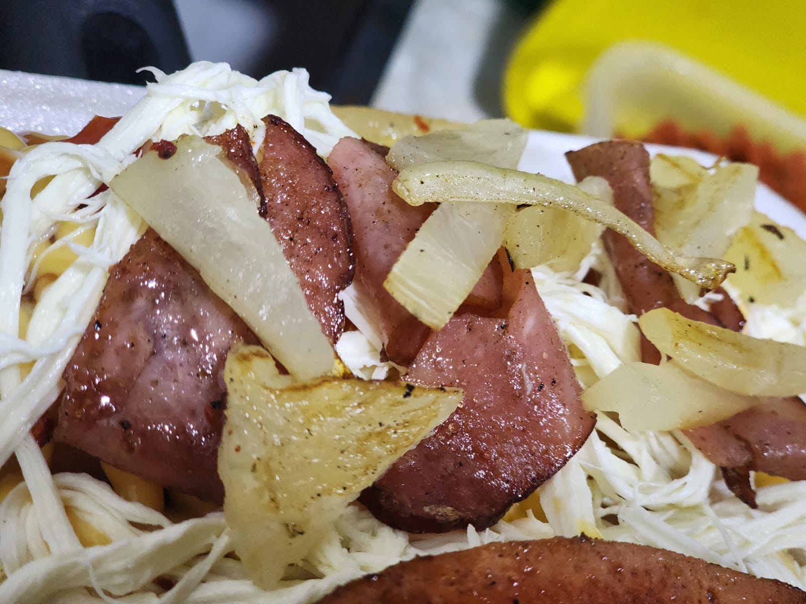Queso hebra, tiras de salchicha, cebolla asada.