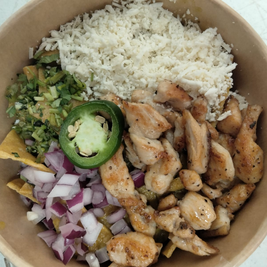CHILAQUILES/POLLO/SALSA/QUESO/CREMA/CEBOLLA/CILANTRO