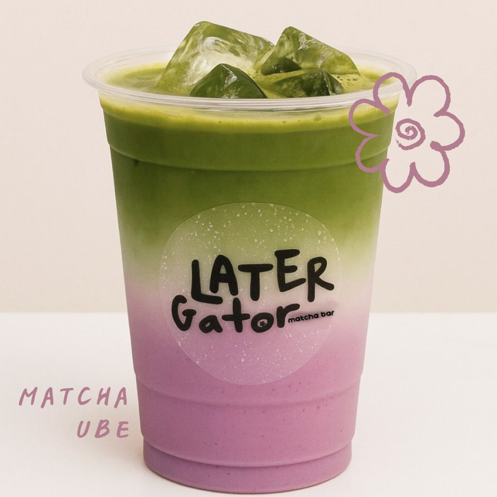 Fusión de matcha ceremonial y extracto orgánico de ube,con notas dulces que evocan vainilla y coco, preparado con leche orgánica de avena. La bebida de especial de Later Gator, presentación 450 ml (16 oz)