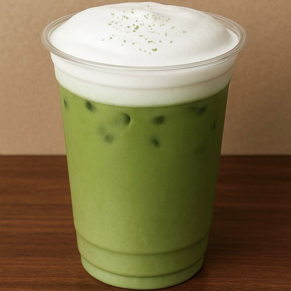 Matcha ceremonial con leche organica de coco y crema de coco espolvoreada con matcha, suave, cremoso y tropical. Presentacion 450 ml (16 oz)