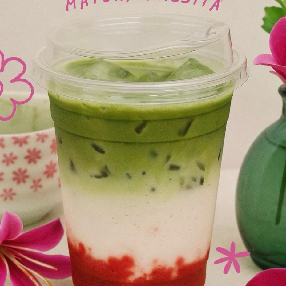 Fusión de puré artesanal de fresa, leche orgánica y matcha ceremonial. fresco , cremoso y naturalmente equilibrado, presentación 450 ml (16 oz)