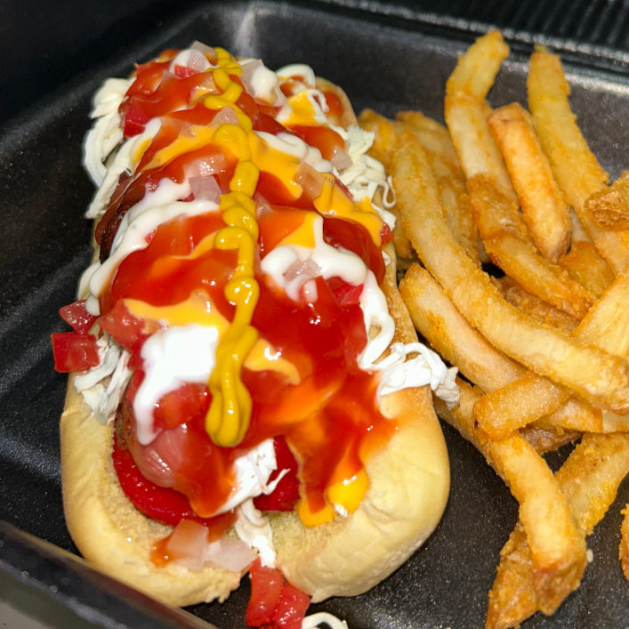 Salchicha jumbo, queso de hebra, tomate, cebolla y aderezos.