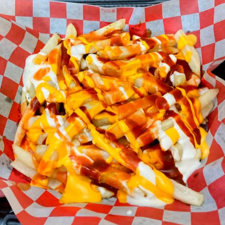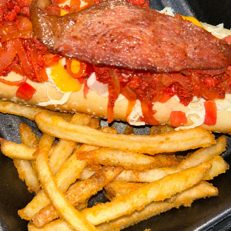Salchicha, queso de hebra, tocino, longaniza, cebolla gratinada con chorizo, tomate, cebolla y aderezos.