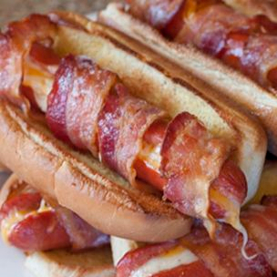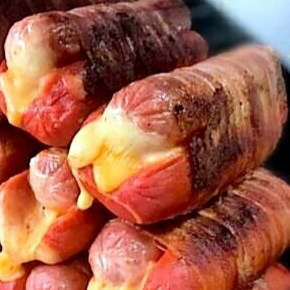 Salchicha de asar rellena de queso y salchicha tradicional envuelta en tocino, queso de hebra, tomate, cebolla y aderezos.