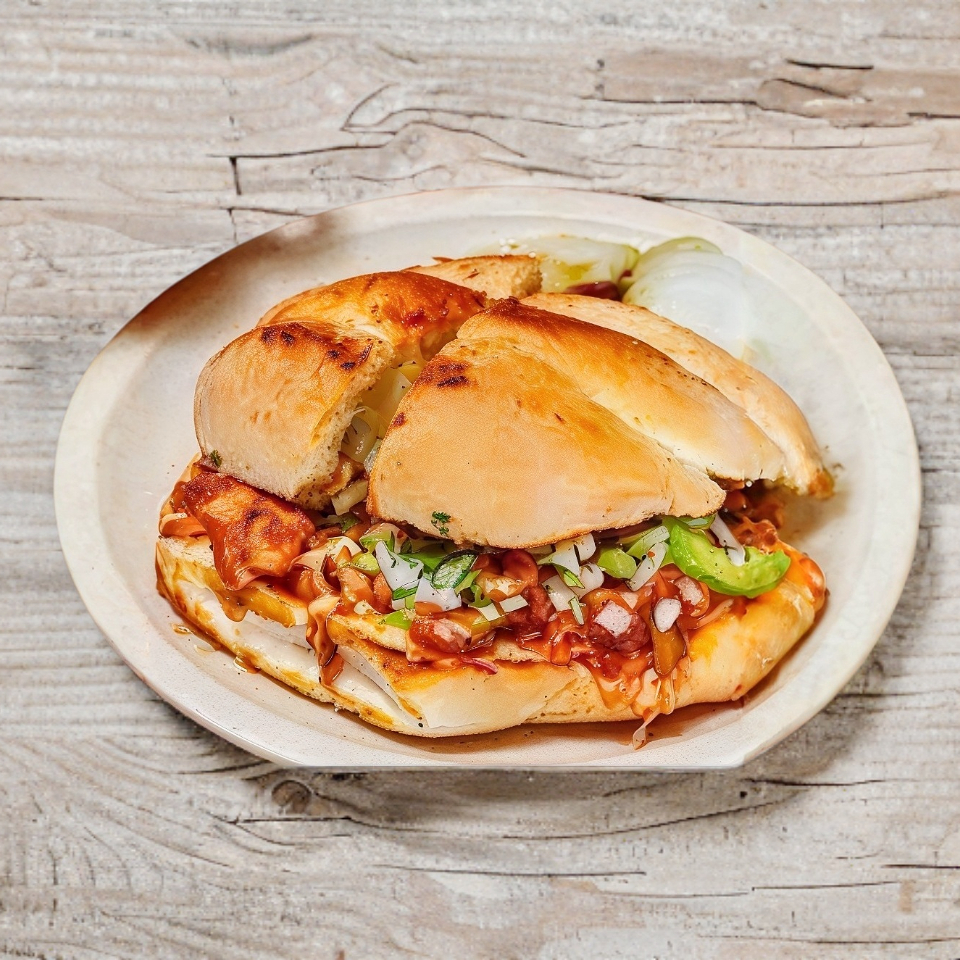 torta con carne al pastor, lechuga y mayonesa, salsa y limon aparte