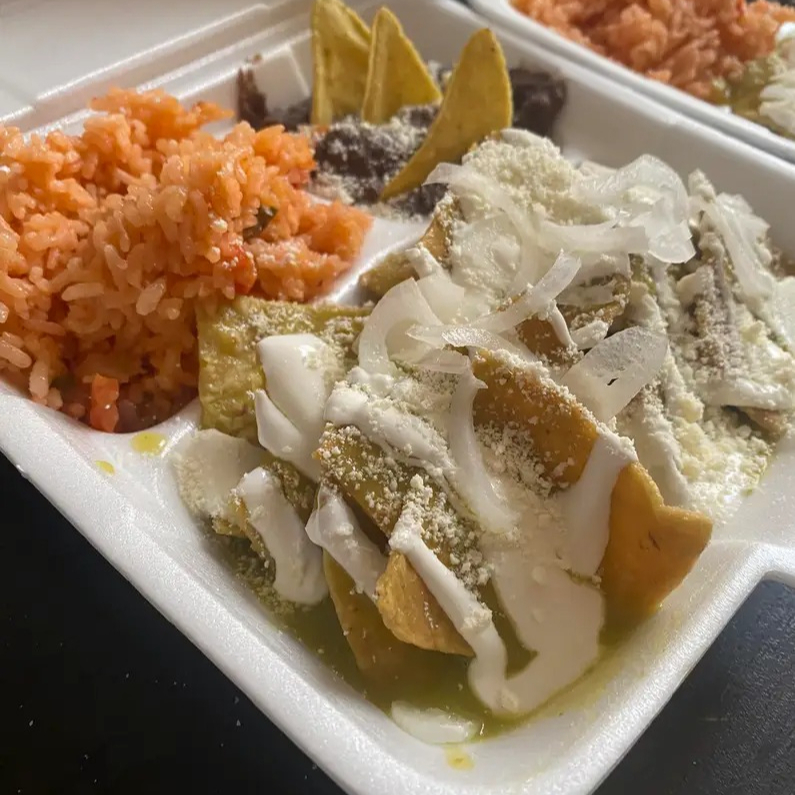 Porción de chilaquiles verdes con crema,queso,cebolla y 80grs de bistec de puerco,acompañado de frijoles, plátano frito con crema y queso INCLUYE SOPA DE LENTEJAS,TORTILLA,SALSA Y AGUA DEL DIA.!!