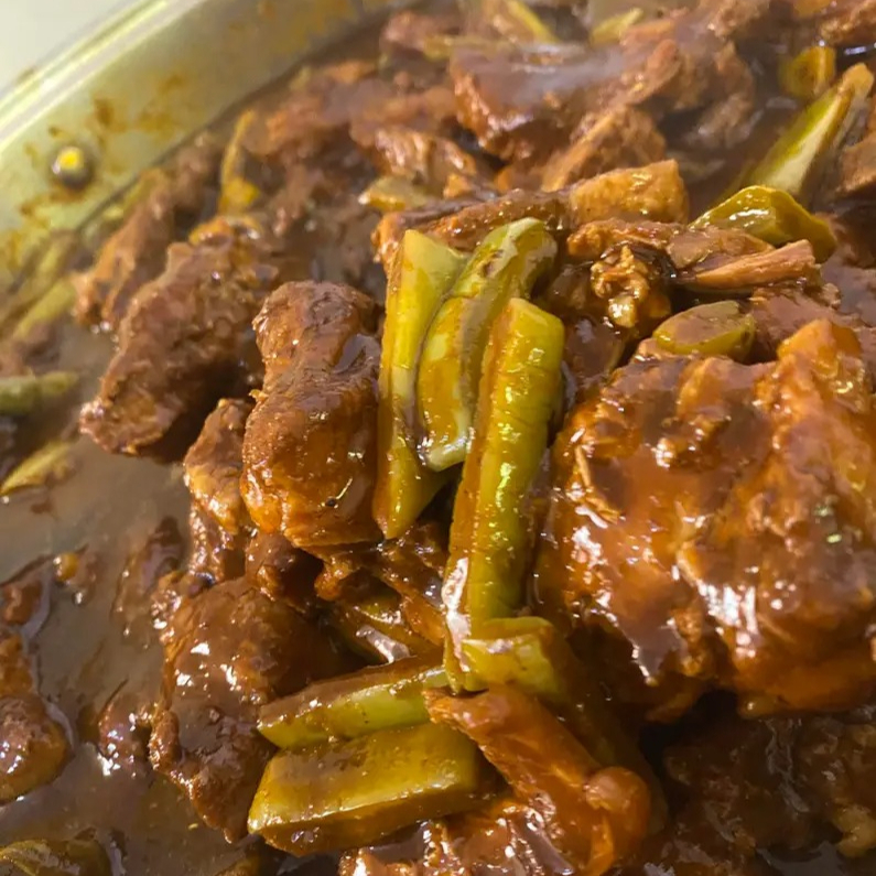 Bisteck de puerco picado con nopales en salsa de chile guajillo,acompañado de arroz,frijoles INCLUYE SOPA DE LENTEJAS,TORTILLAS,SALSA Y AGUA DEL DIA
