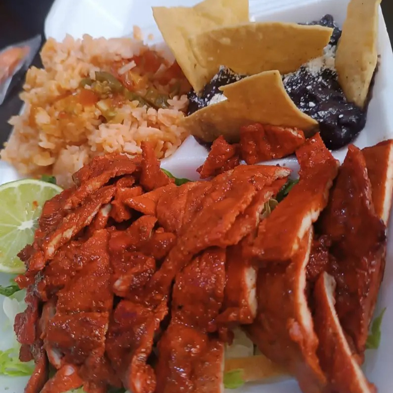 Bisteck de carne enchilada acompañado de arroz,frijoles y ensalada, INCLUYE SPAGETYY BLANCO,AGUA,TORTILLAS,SALSA