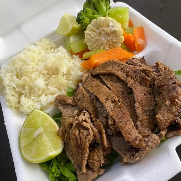 Bisteck asado,con lechuga,arroz,frijoles con queso o platanitos fritos, INCLUYE SOPA DE LENTEJAS,TORTILLAS,SALSA Y AGUA