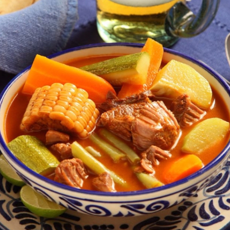 Caldo de res rojo, con verduras y bolitas de masa,acompañado de arroz. INCLUYE entrada de spaghetti blanco,cebolla,cilantro,chile,limones, tortillas,salsa,agua y flan.