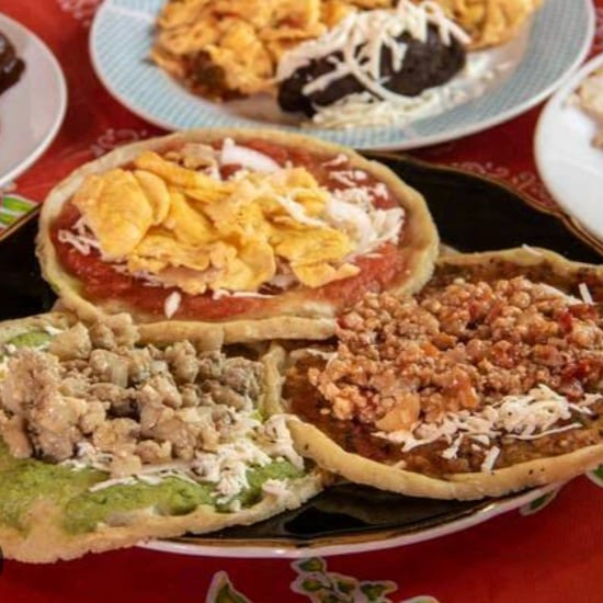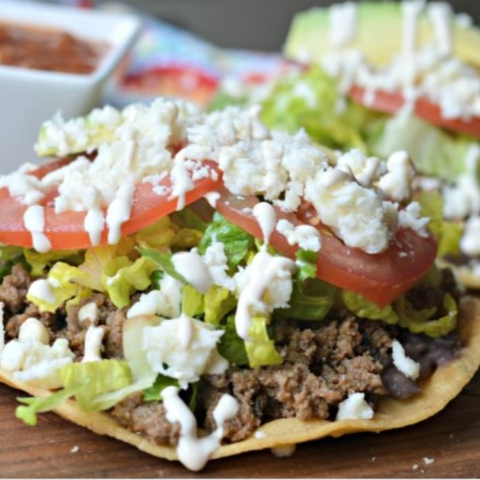 Tortilla de maiz doradita, cubierta de frijol, lechuga, una proteína a elegir, tomate, crema,y queso rallado