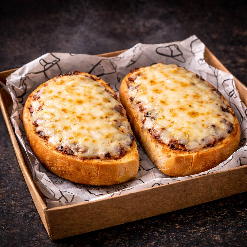 Bocados de pan bolillo tostado con mantequilla especiada y queso gratinado.