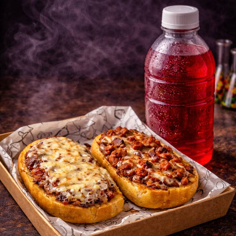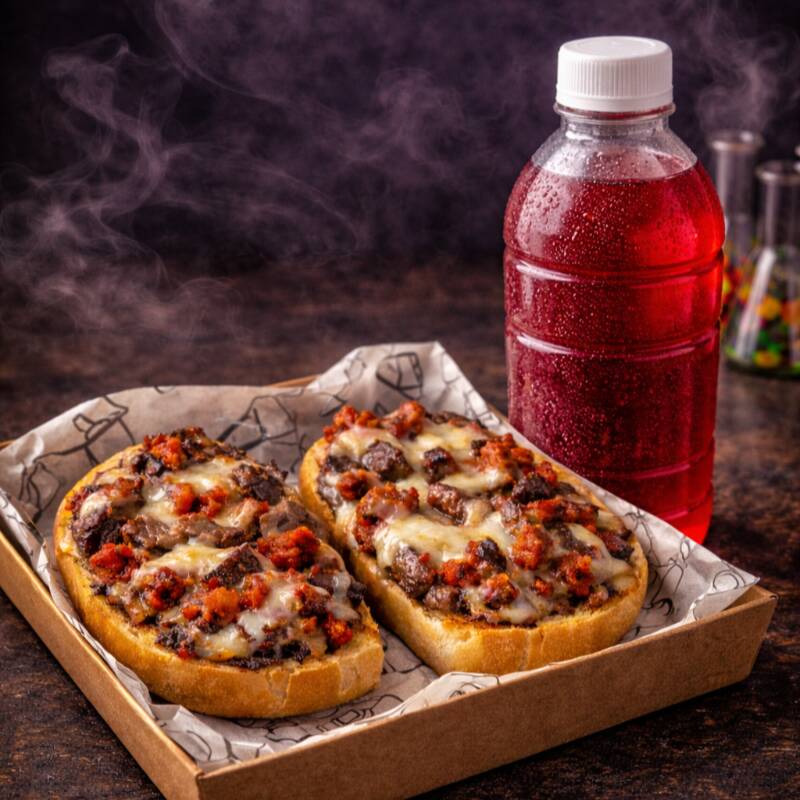 Nuestro mollete insignia: arrachera y chorizo sobre frijoles refritos, cubierto con queso gratinado en pan bolillo tostado. Incluye agua de jamaica natural embotellada (500 ml).