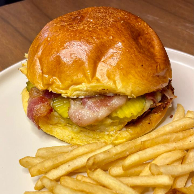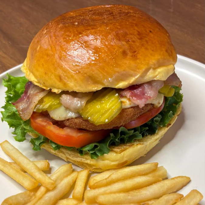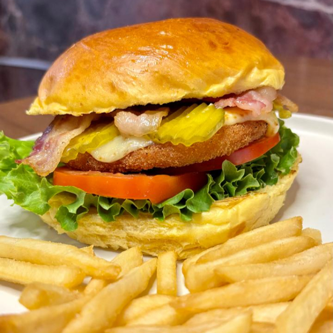 Hamburguesa de Tenders de Pollo, Lechuga, Tomate, Tocino, Ranch y Pepinillos