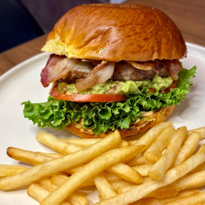 Hamburguesa de Carne de Arrachera, Cheddar, Mayochipotle, Lechuga, Tomate, Guacamole y Tocino