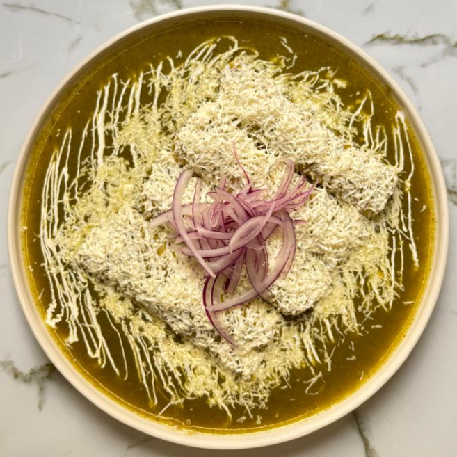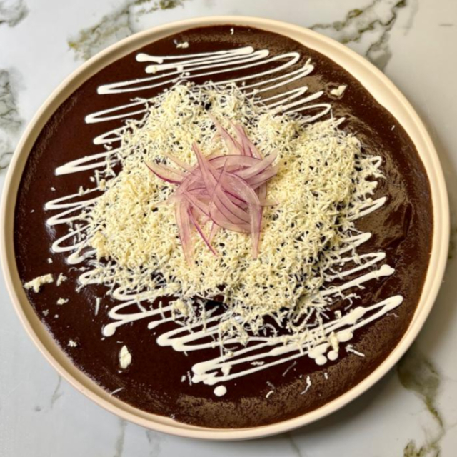 4PZS. Tortilla rellena de proteína a elegir, bañada con salsa de mole, crema, queso y cebolla