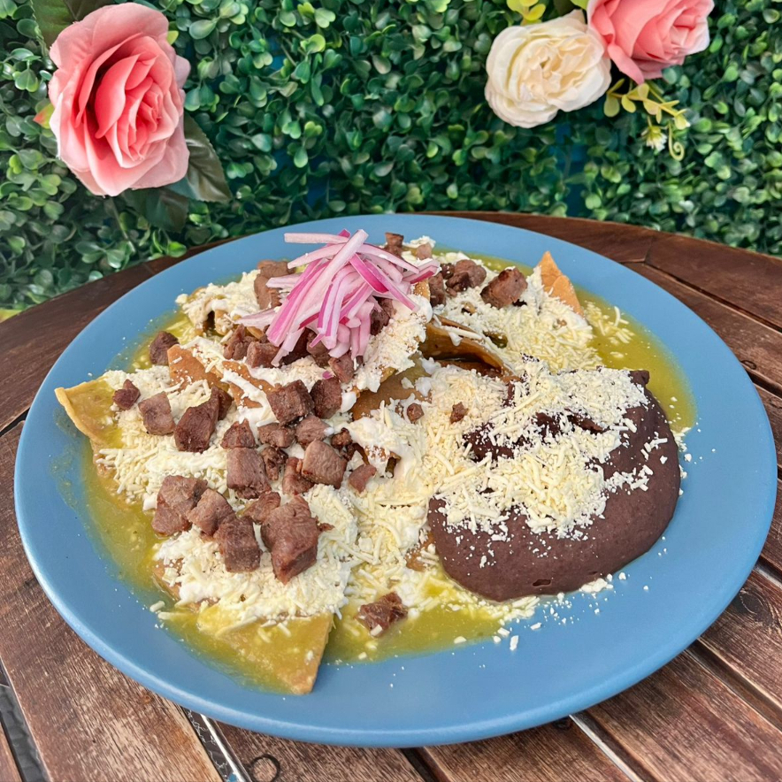 Totopos bañados en salsa, crema, queso, cebolla morada y una proteina. Guarnicion de frijoles refritos. Especialidades de la casa. (UNA ORDEN)