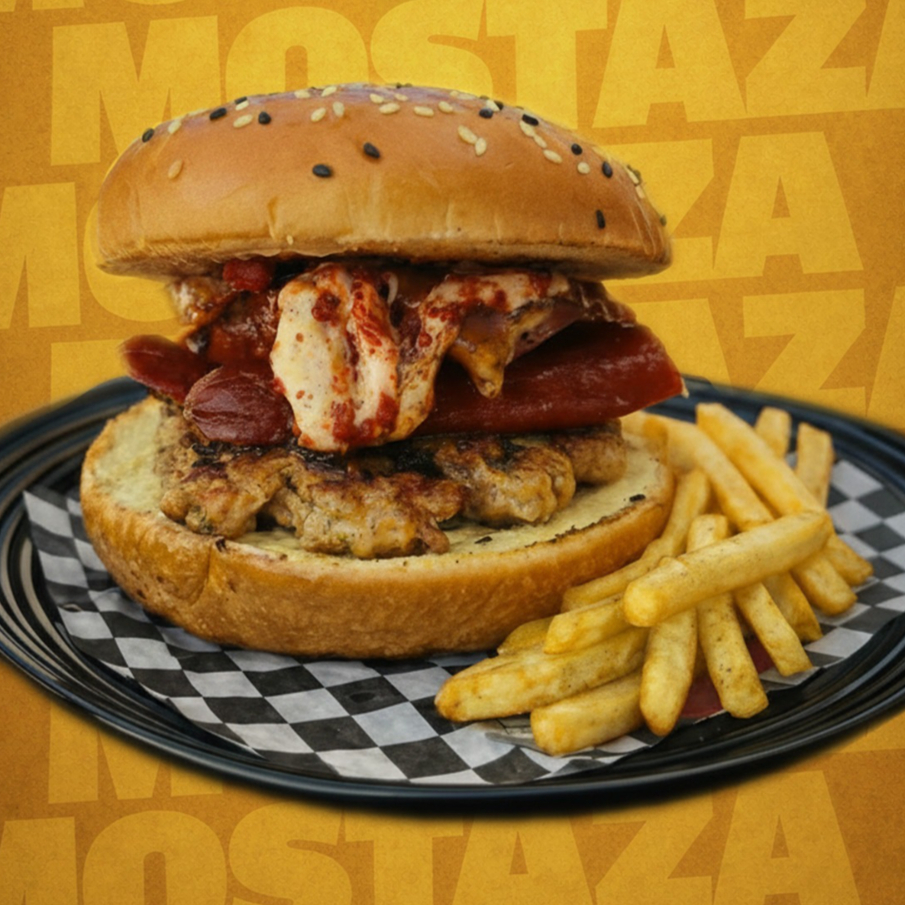 Combinación perfecta entre dulce y salado: Carne de res jugosa bañada por queso manchego y cheddar derretidos, mermelada especial de tocino, lechuga y aderezos. Incluye porción de papas a la francesa (120gr aprox) sazonadas con lemmon pepper y salsa cátsup.