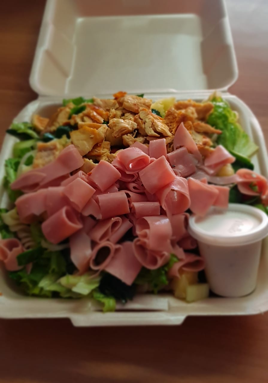 Pasta, mezcla de lechuga, espinaca, piña, jamón, pollo, tomate, pepino , apio, morrones, cebolla,