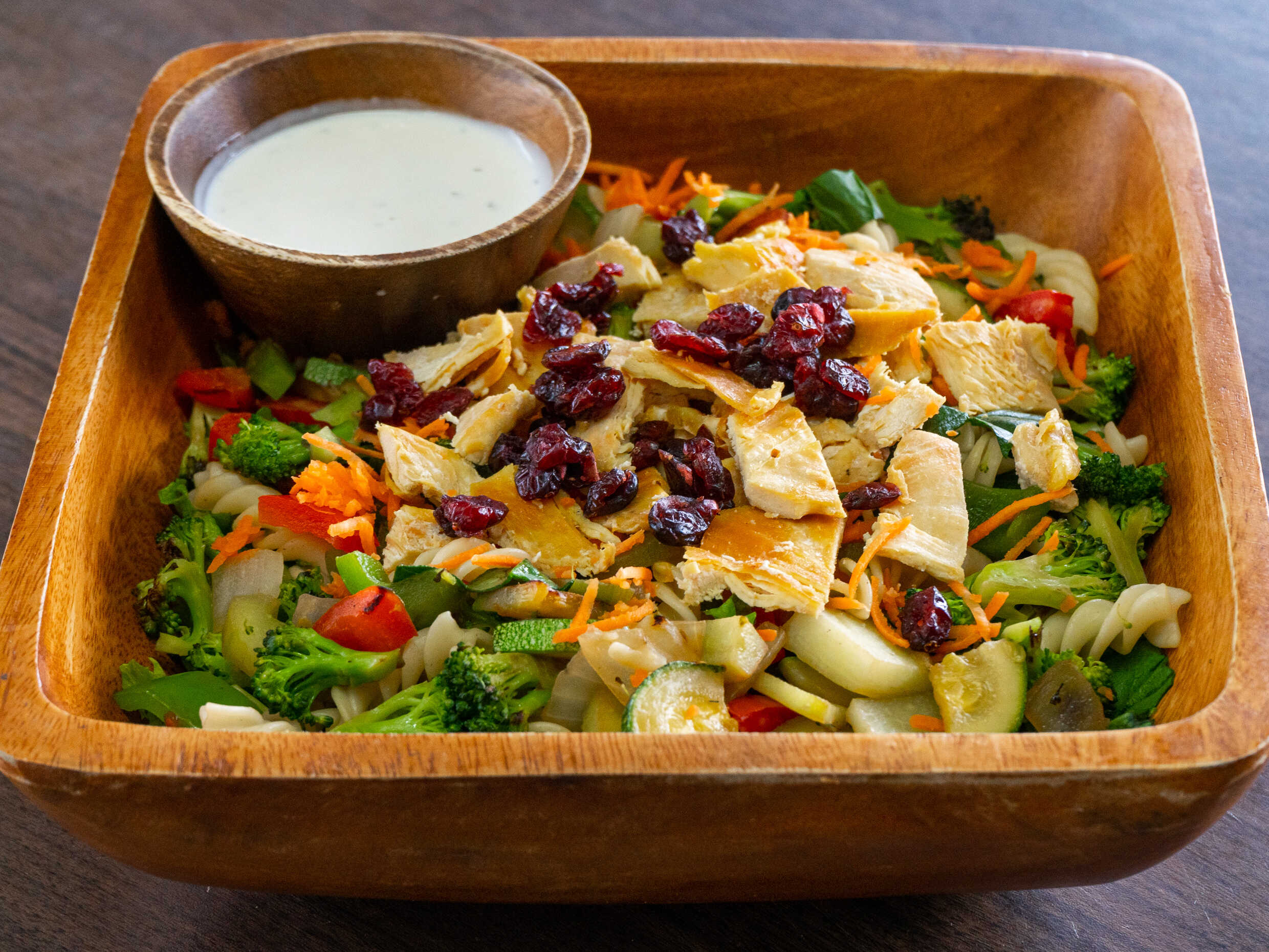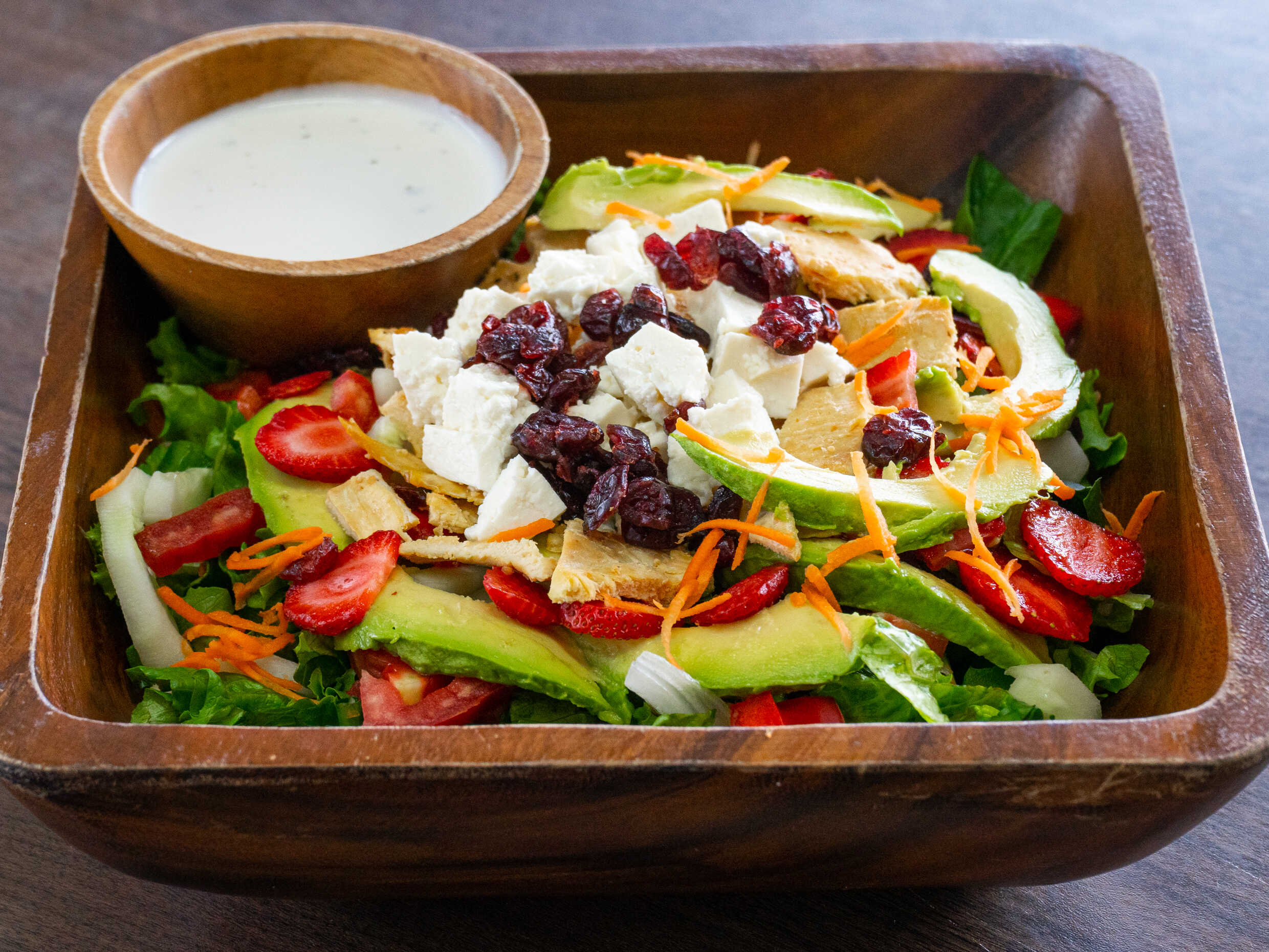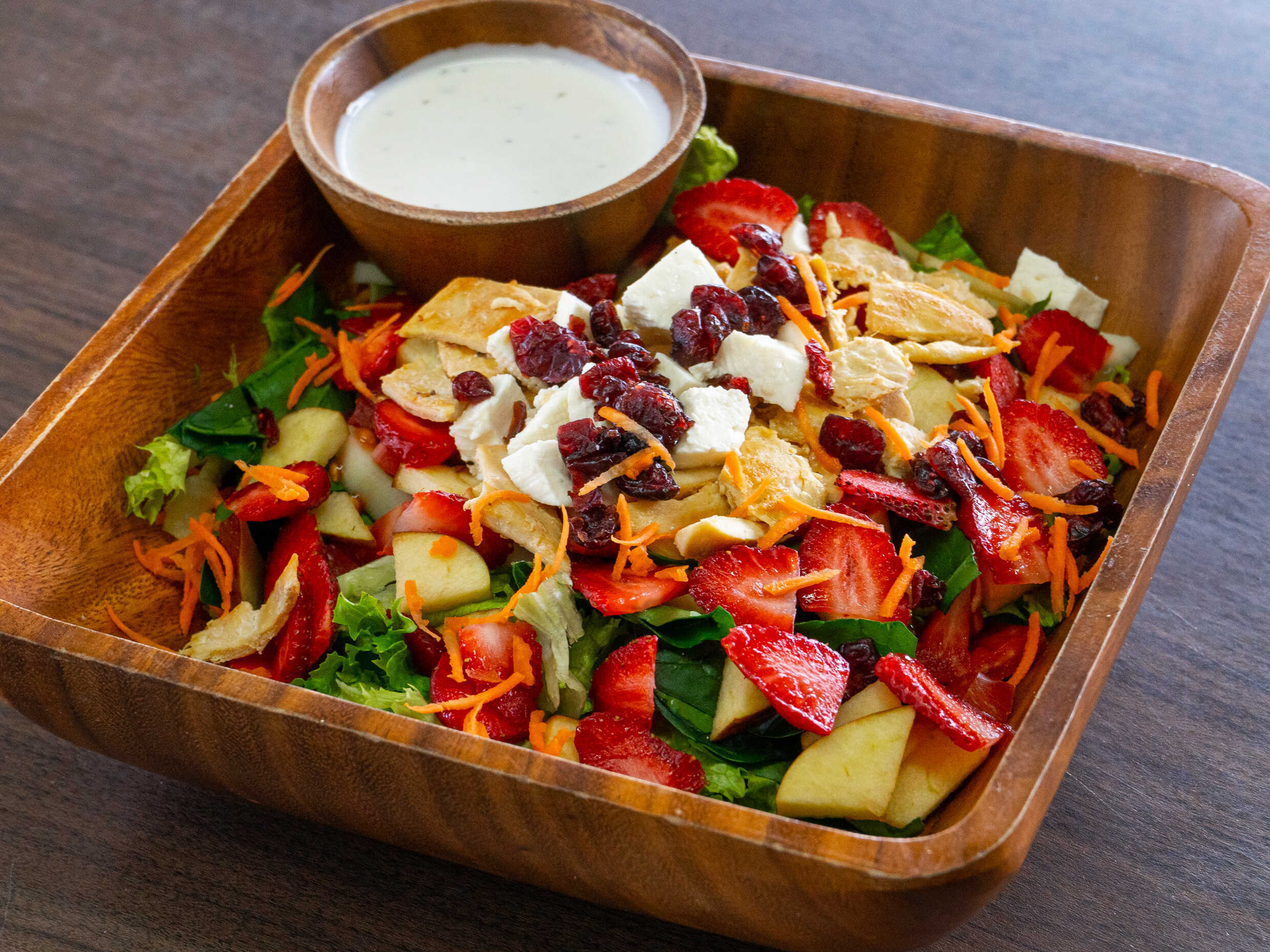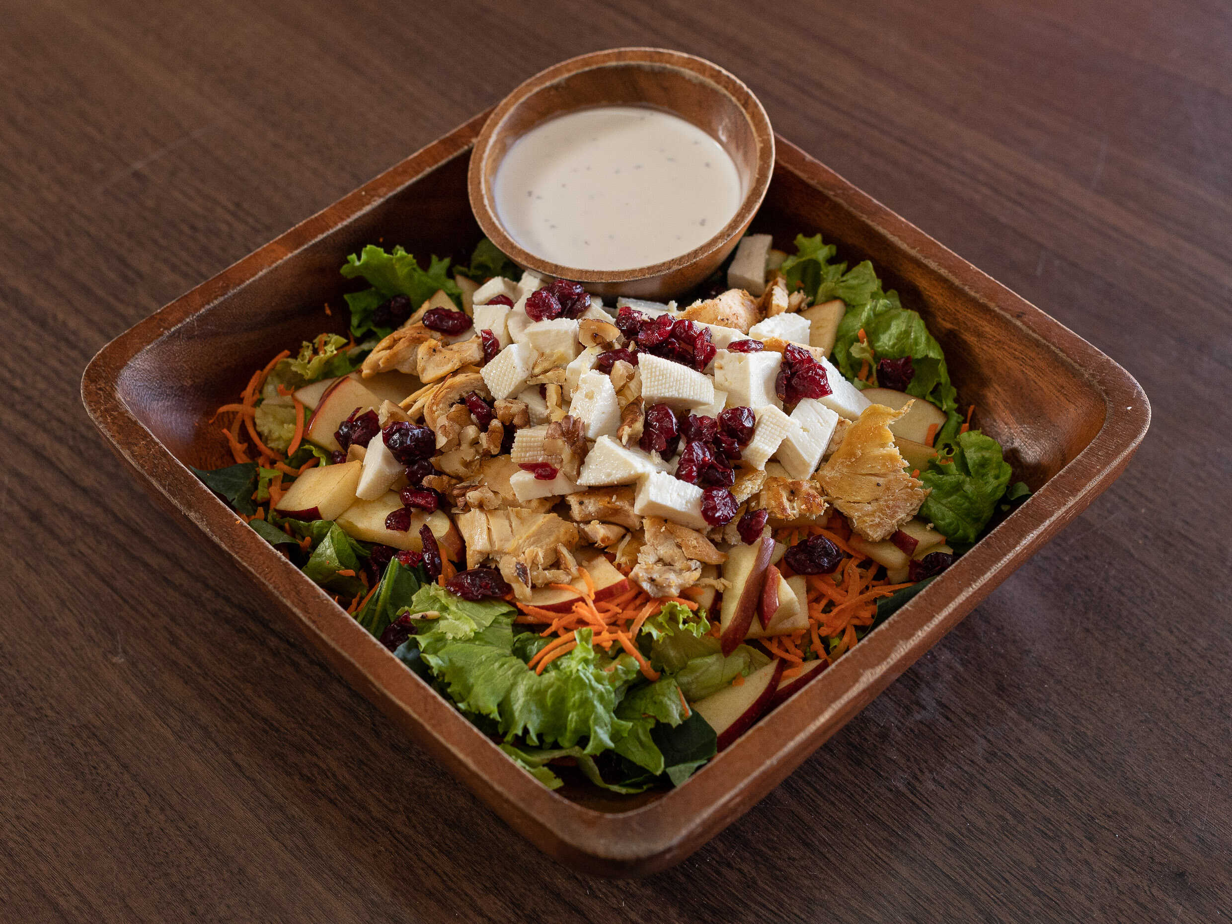 mezcla de lechugas, espinaca, zanahoria rayada, nuez, manzana, arandano, pollo asado, queso y aderezo Ranch