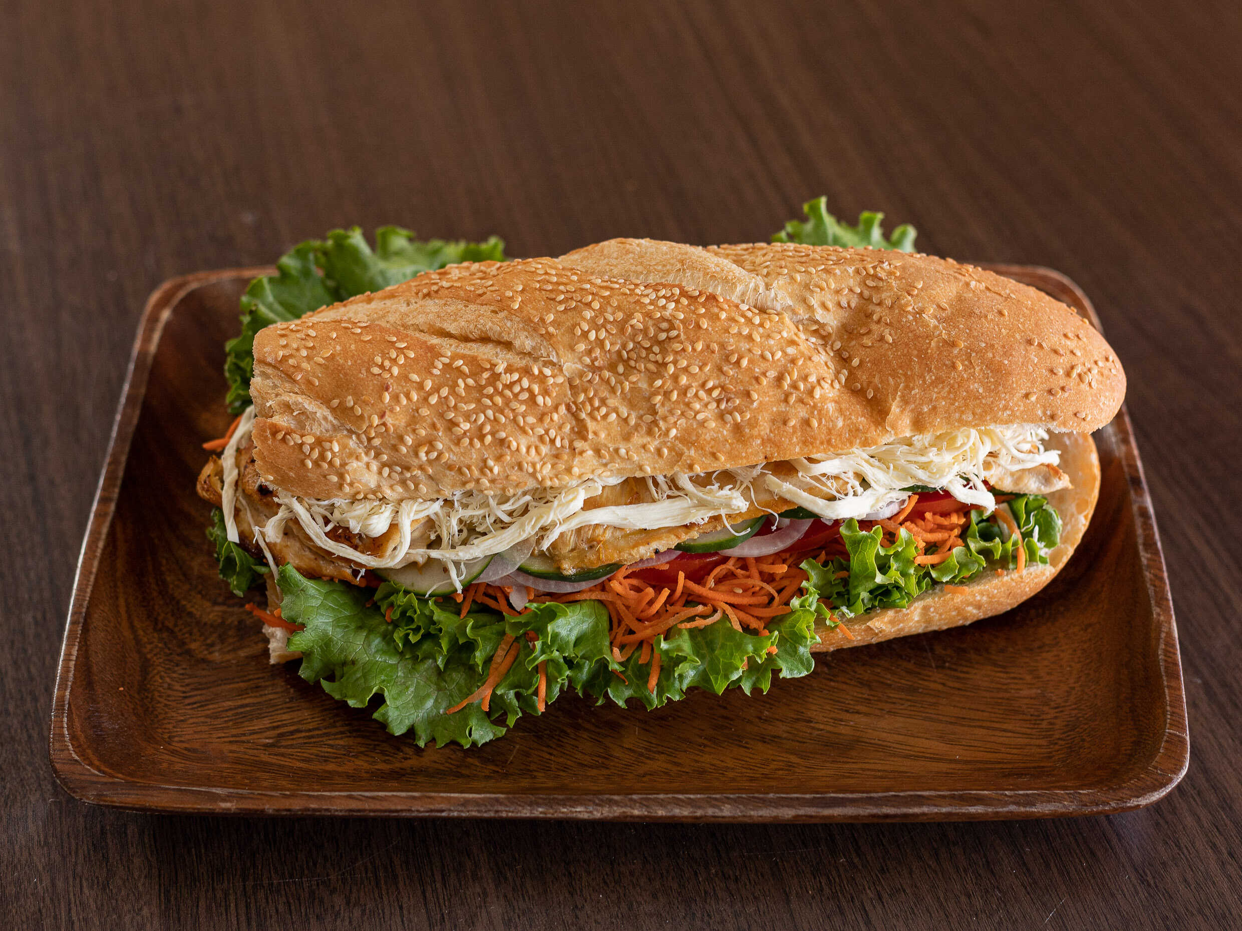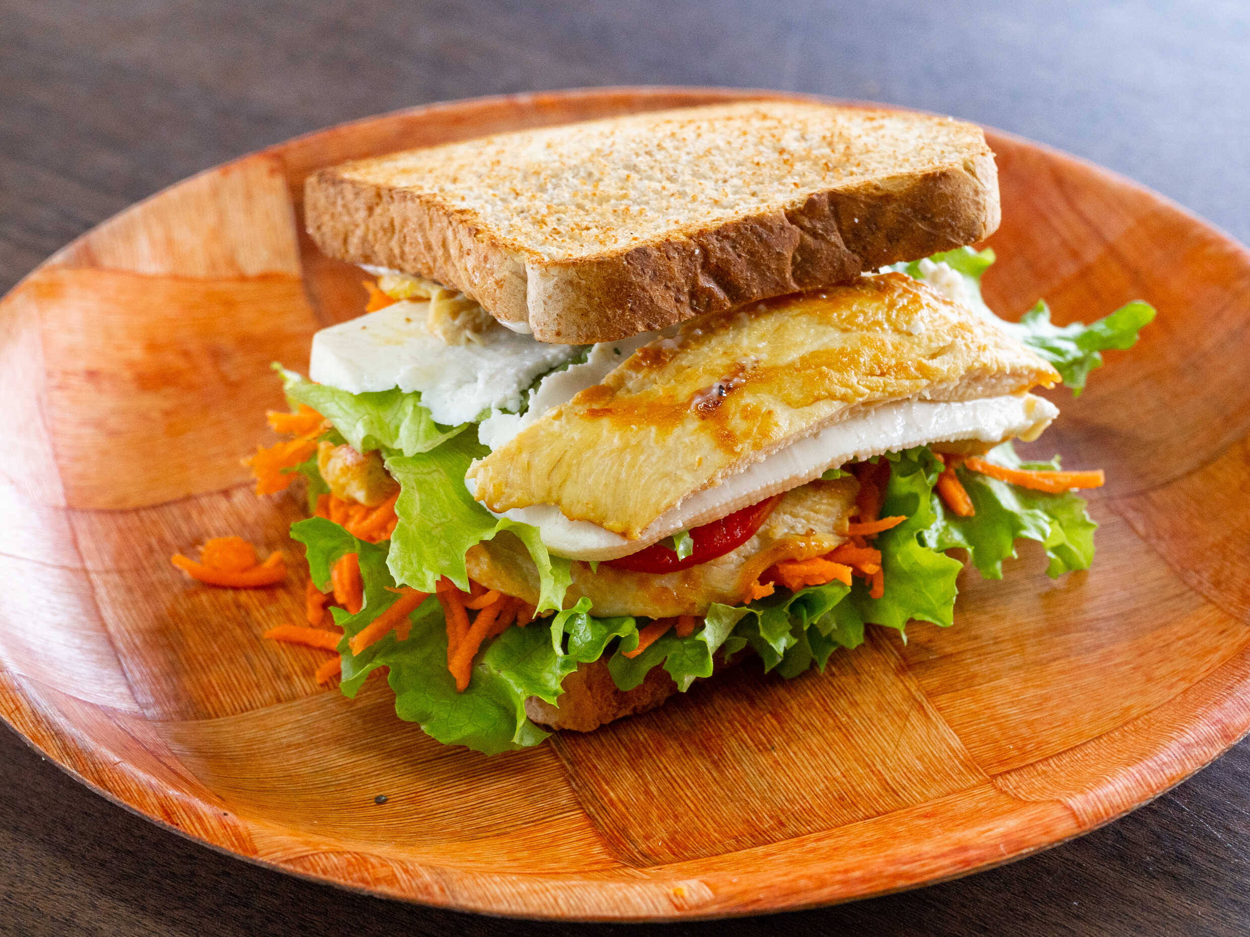 Jamón de pavo, pechuga asada de pollo, lechuga, tomate, mayonesa,, queso fresco zanahoria rallada y pan integral